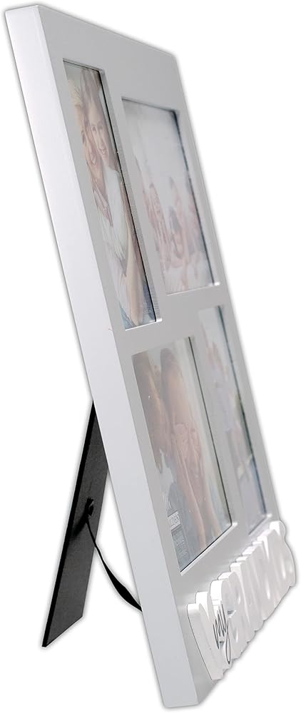 • ALLURING LOOK: This gray collage frame holds (4) 4x6 inch photos in 3.5x5.5 inch openings; smooth finish; white shaped wood attachment with gray screen-printing; vertical and horizontal photos; Approximate dimensions: 13 (W) x 14 (H) x 0.8 (D) inches