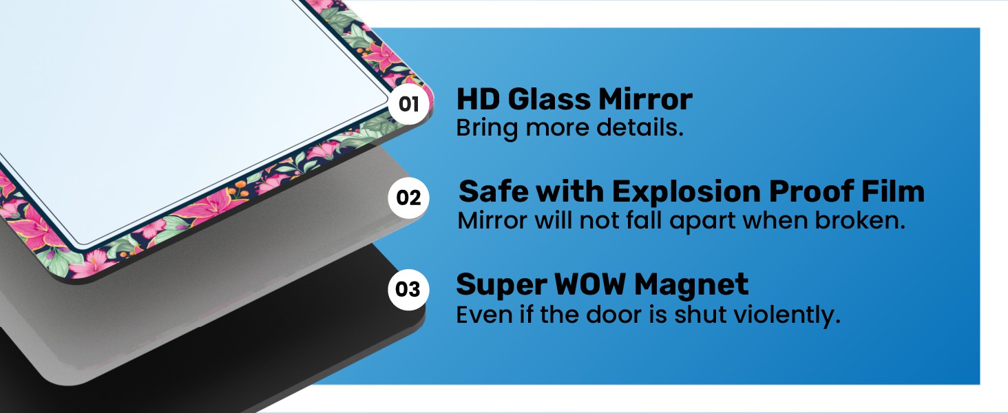 • تصوير واضح عالي الدقة. مرايانا ليست مجرد أسطح عاكسة - يتم استخدام زجاج عائم عالي الجودة لصنع المرايا لضمان صور أكثر وضوحًا وواقعية. تم تصميم مرآة الخزانة الخاصة بنا لإعطاء الأولوية للسلامة وتوفير الوضوح التام. احتفظ بها آمنة وواضحة لاحتياجاتك الشخصية وفحوصات الماكياج.