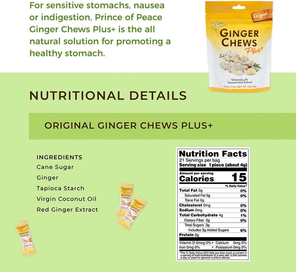 طبيعي 100%. مضغ الزنجبيل من أمير السلام يوفر راحة طبيعية من عسر الهضم ومصنوع من الزنجبيل الحقيقي. إنها مصنوعة من مكونات طبيعية 100٪ وهي نباتية وخالية من الغلوتين وكوشير وغير معدلة وراثيًا وخالية من الكافيين.