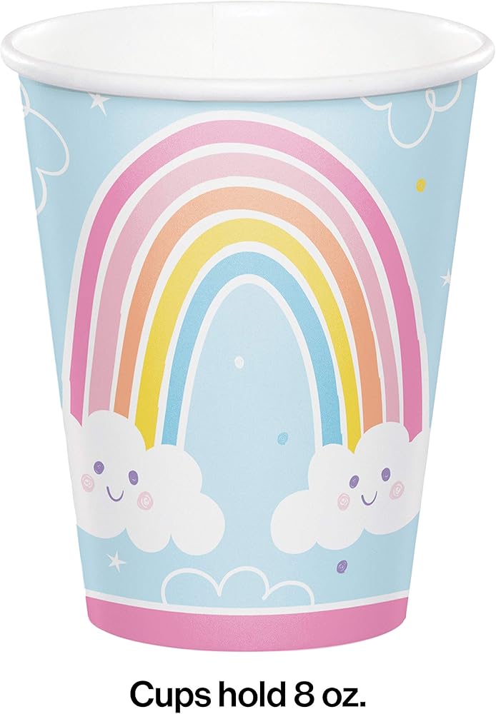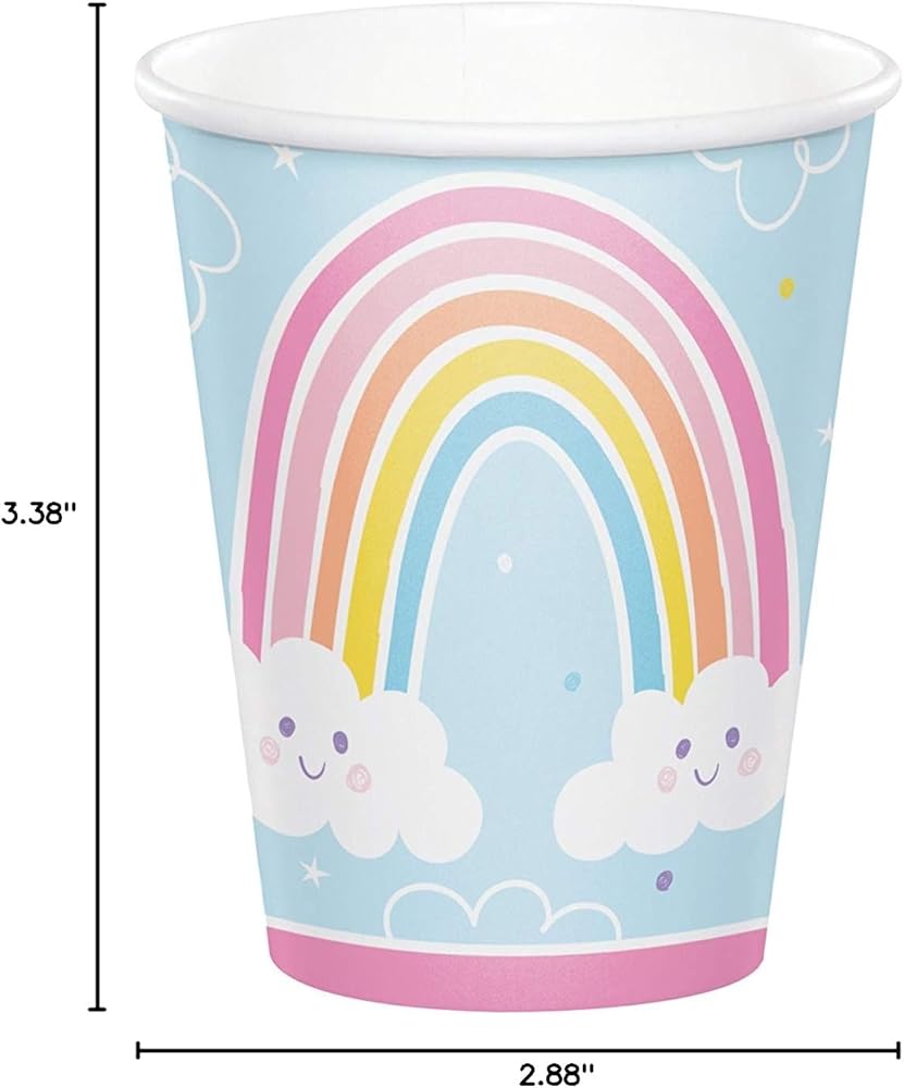Strawberry lemonade will taste a little bit sweeter when served in the Happy Rainbow Paper Cups. These sturdy paper cups hold 8 oz and feature a bright, cheery rainbow and smiling clouds with a pink, blue, yellow, and white theme. Sold in packs of 8, these disposable paper cups coordinate with all Happy Rainbow party supplies.