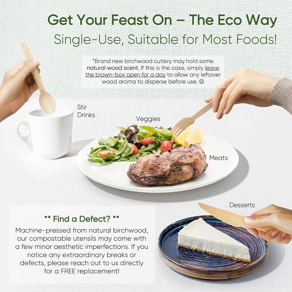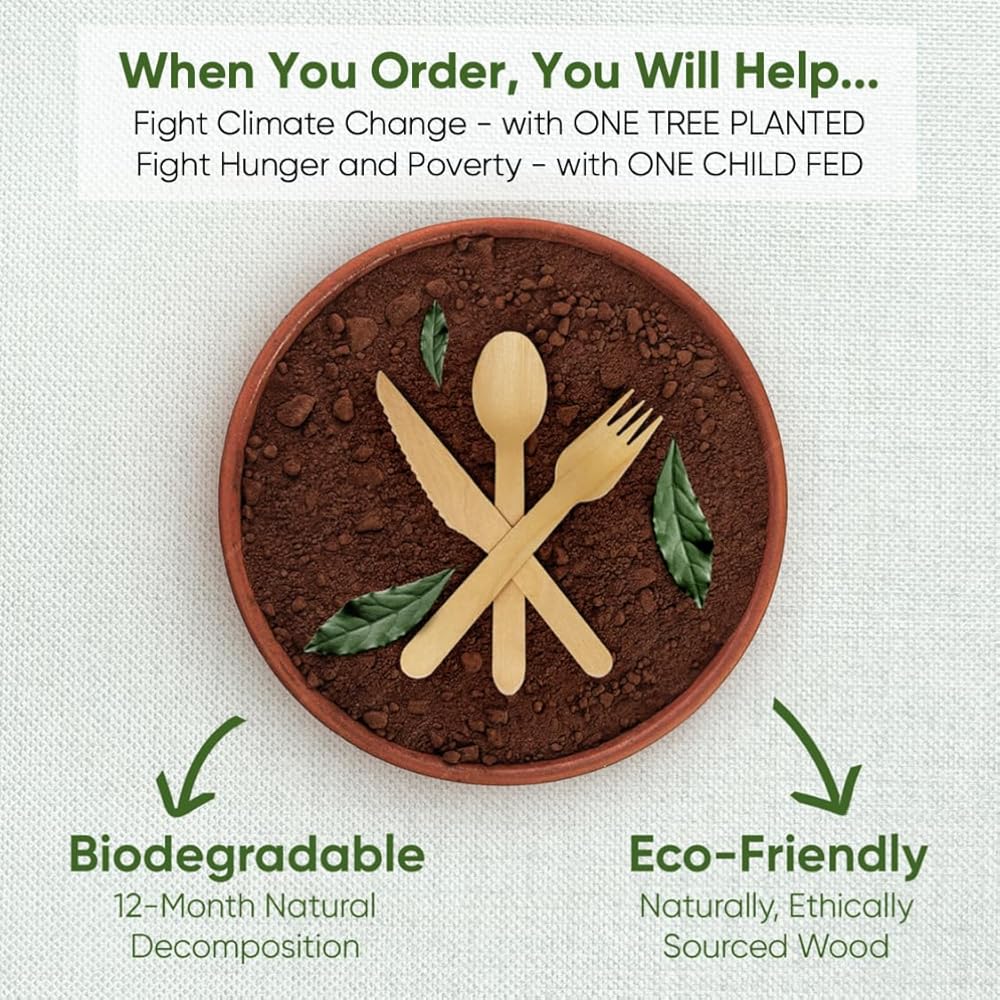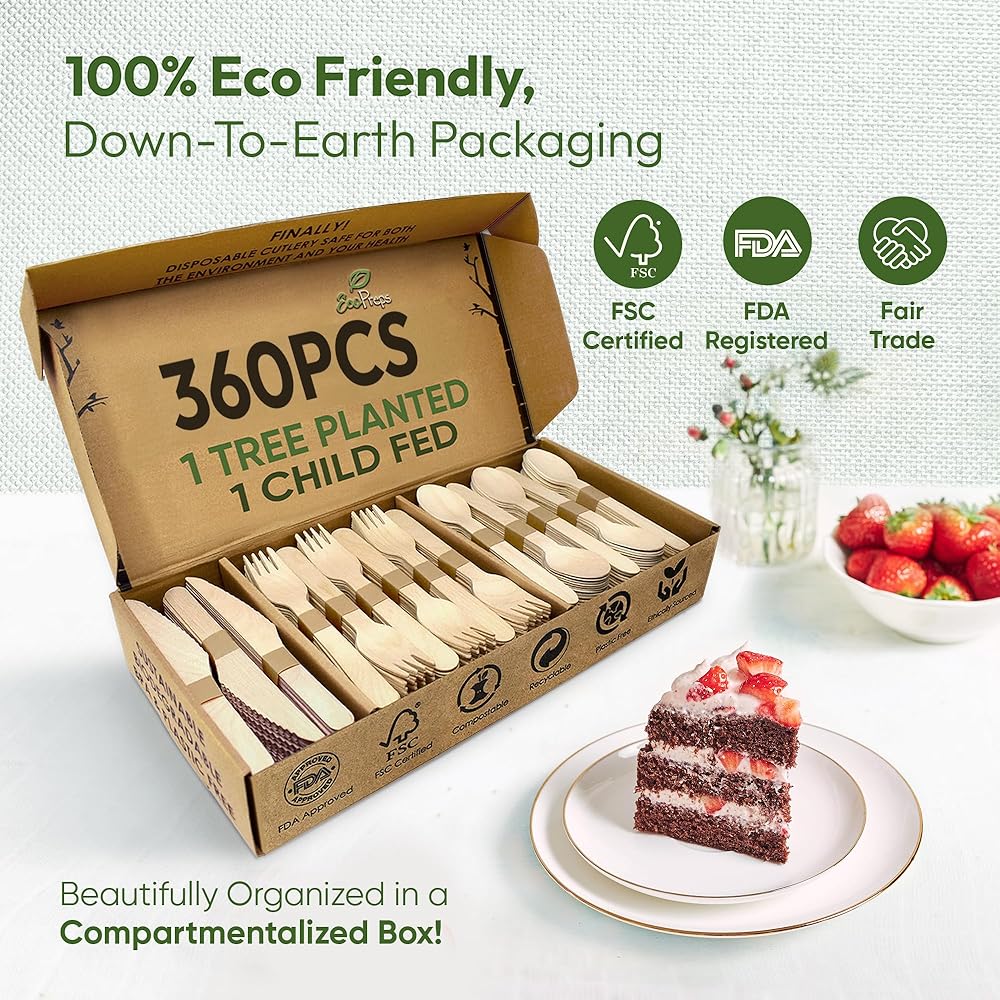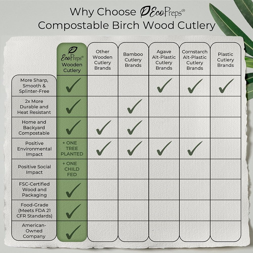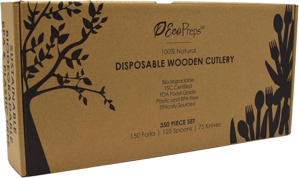 • 🐢 أدوات مائدة للاستعمال مرة واحدة ومستدامة. أدوات المائدة المصنوعة من خشب البتولا من EcoPreps قابلة للتحلل البيولوجي بالكامل. على عكس أدوات المائدة البلاستيكية، فإن أدوات المائدة الخشبية التي تستخدم لمرة واحدة لن تبقى في مكبات النفايات لسنوات. نحن نزرع شجرة / نطعم طفلاً مع كل طلب - كل ذلك من أجل كوكب أفضل.