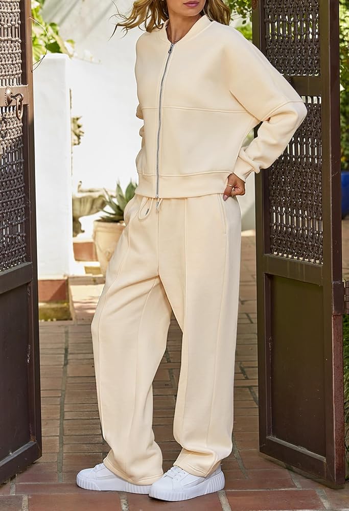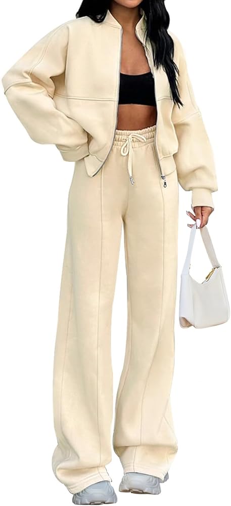 المزايا: مجموعات عرق متطابقة للنساء، أكمام طويلة، لون ثابت، سترة بسحاب كامل، مبطنة بالصوف، كتف منسدل، سويت شيرت برقبة دائرية، حاشية وأساور أكمام مضلعة، بنطال رياضي طويل بأرجل واسعة، خصر عالٍ، جيبان جانبيان، حزام خصر مطاطي برباط، أسلوب فضفاض عارضة.