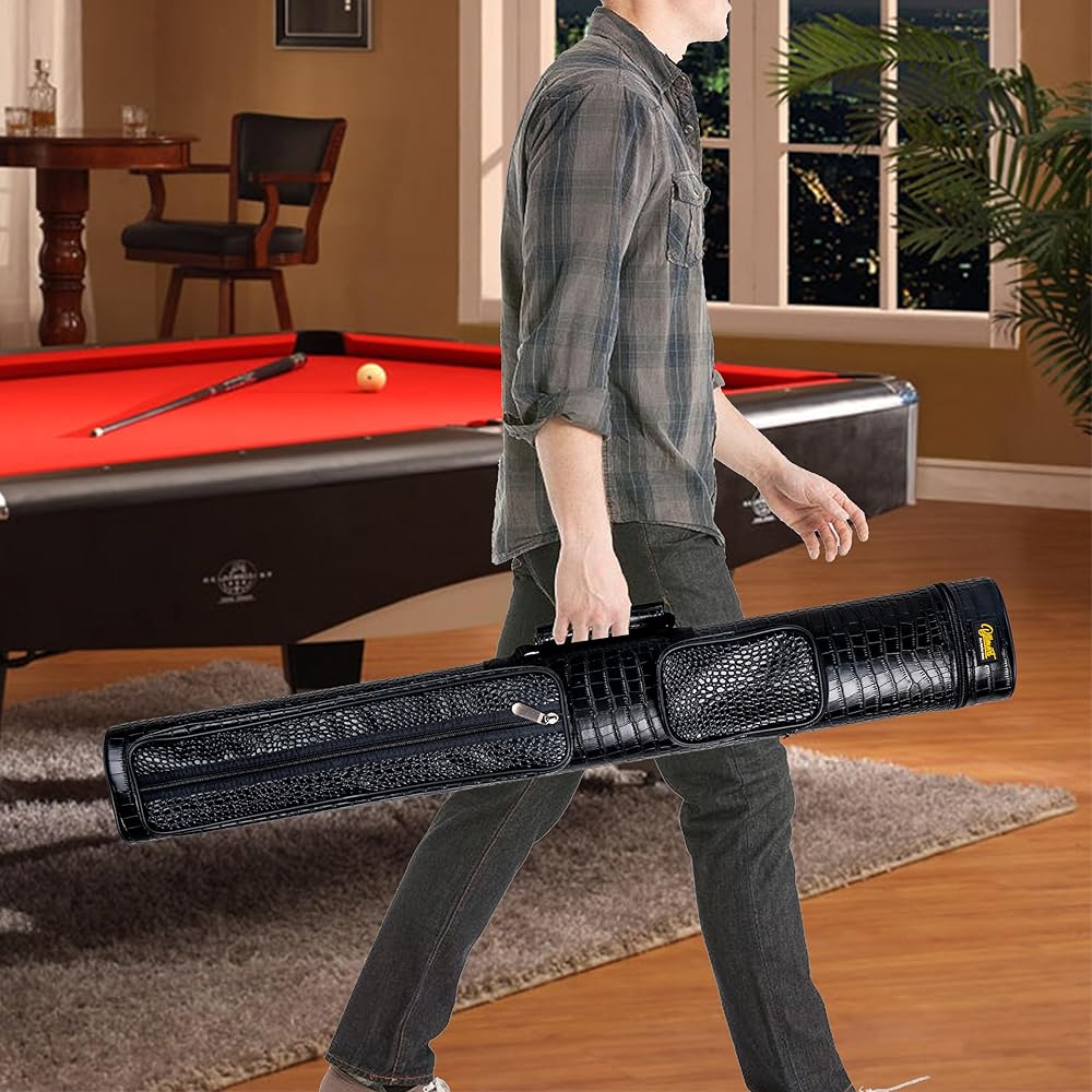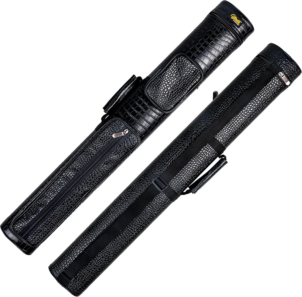 Protect your valuable pool cues with this high-quality pool cue case. Made from premium PU leather, offers superior protection against bumps and scratches, ensuring that your cues remain in excellent condition. The inner soft liner of the case prevents friction damage, further safeguarding your cues during transportation. With zippered pockets, this case allows for easy storage of additional accessories such as tips, chalk, and bridgehead. Choose from a variety of styles to match your taste and enjoy the convenience and fashion that this pool cue case brings to your game. Designed to fit two cues, this case is perfect for players who want to bring along an extra cue or participate in doubles games. Organize your cues and play with confidence using this reliable and stylish pool cue case.