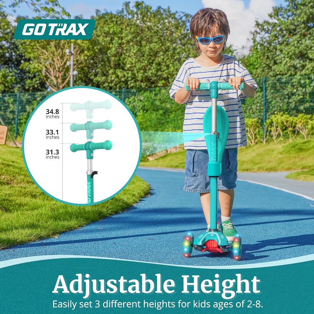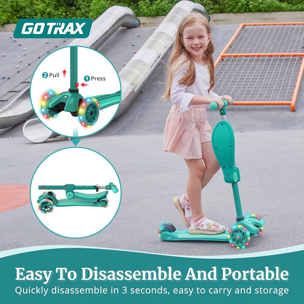 • عجلات فلاش لافتة للنظر: مزود بـ 3 عجلات مضاءة LED، سكوتر Gotrax KS3 يخلق تأثيرًا بصريًا مذهلاً أثناء الركوب، مما يجعل طفلك مركز الاهتمام. تعد السلامة أمرًا بالغ الأهمية، حيث تضيء العجلات حتى في الظلام، مما يوفر راحة البال للآباء.