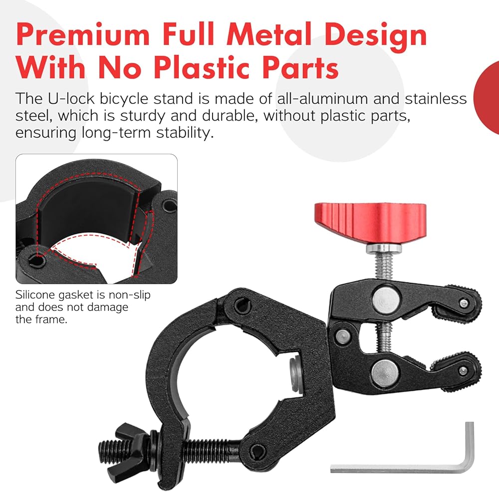 All-Metal Design: Our U-lock bike mount is made of all-aluminum and stainless steel, which is sturdy and durable, without plastic parts, ensuring long-term stability.