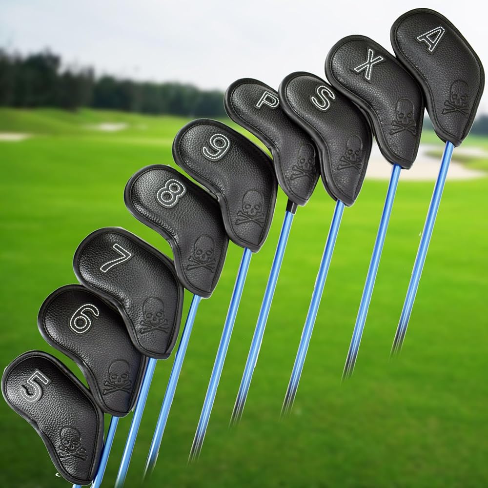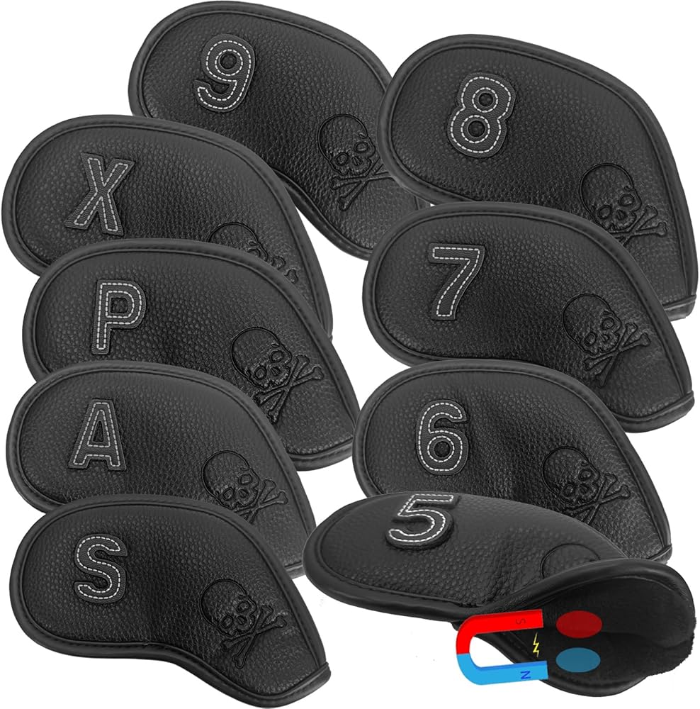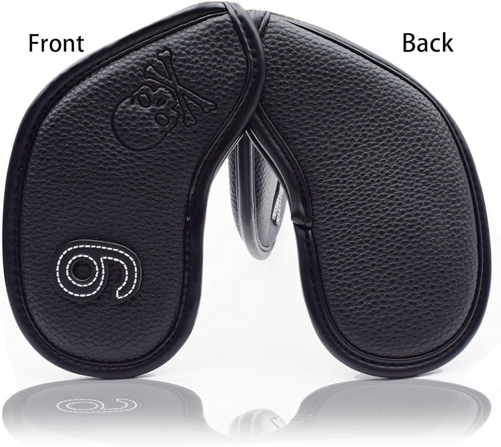 Premium Magnetic Leather Iron and Wedge Golf Club Head Covers | Set of 9| Fits Most Clubs | Embroidered Club Label on Both Sides of Club Head Cover
