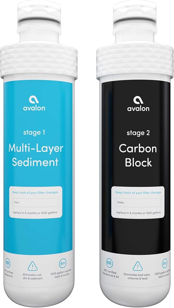 The Avalon 2 Stage replacement water filters are suitable for Avalon Bottle-less Water Coolers. It consists of 2 filters An NSF certified activated carbon filter (Listed as model A4FILTER) which will eliminate chlorine lead rust or any harmful or unwanted minerals from the tap water that flows through it As well as a sediment filter (Listed as model A5FILTER) to filter out any rust or large particles of dirt in the water The filters can be easily replaced into the cabinet of the water cooler The filters have a capacity of 1 500 gallons of water and is made to last for 6 months of use They have a flow rate of 0 5 gallons per minute Both filters must be used together Your water will be tasting crisp and pure with these installed in your water cooler
