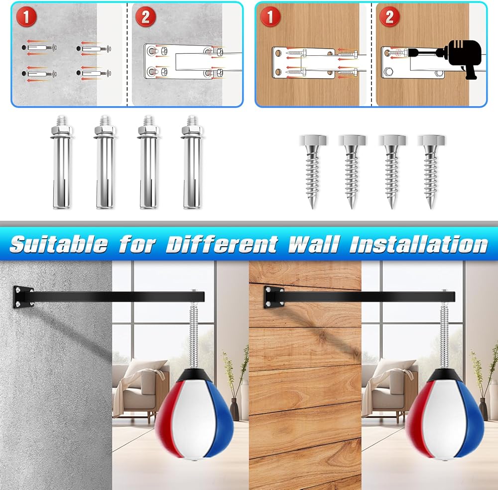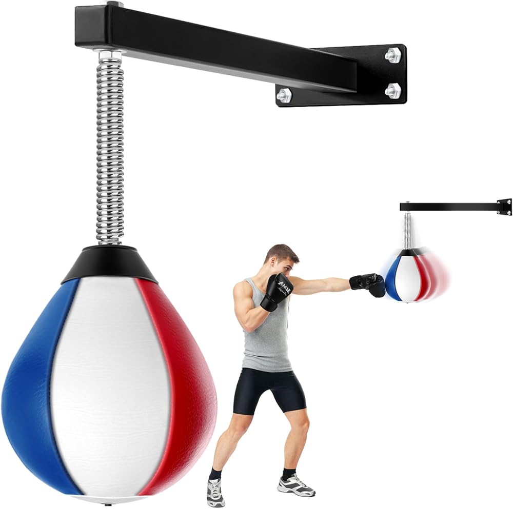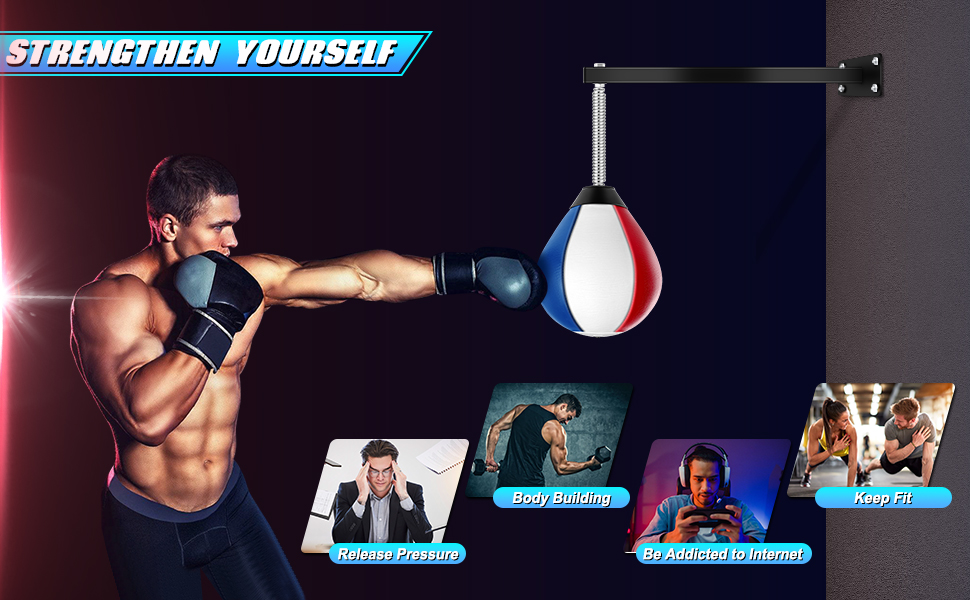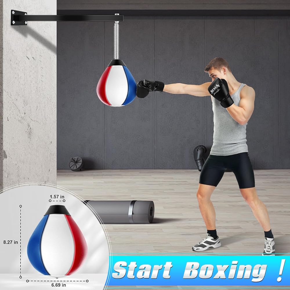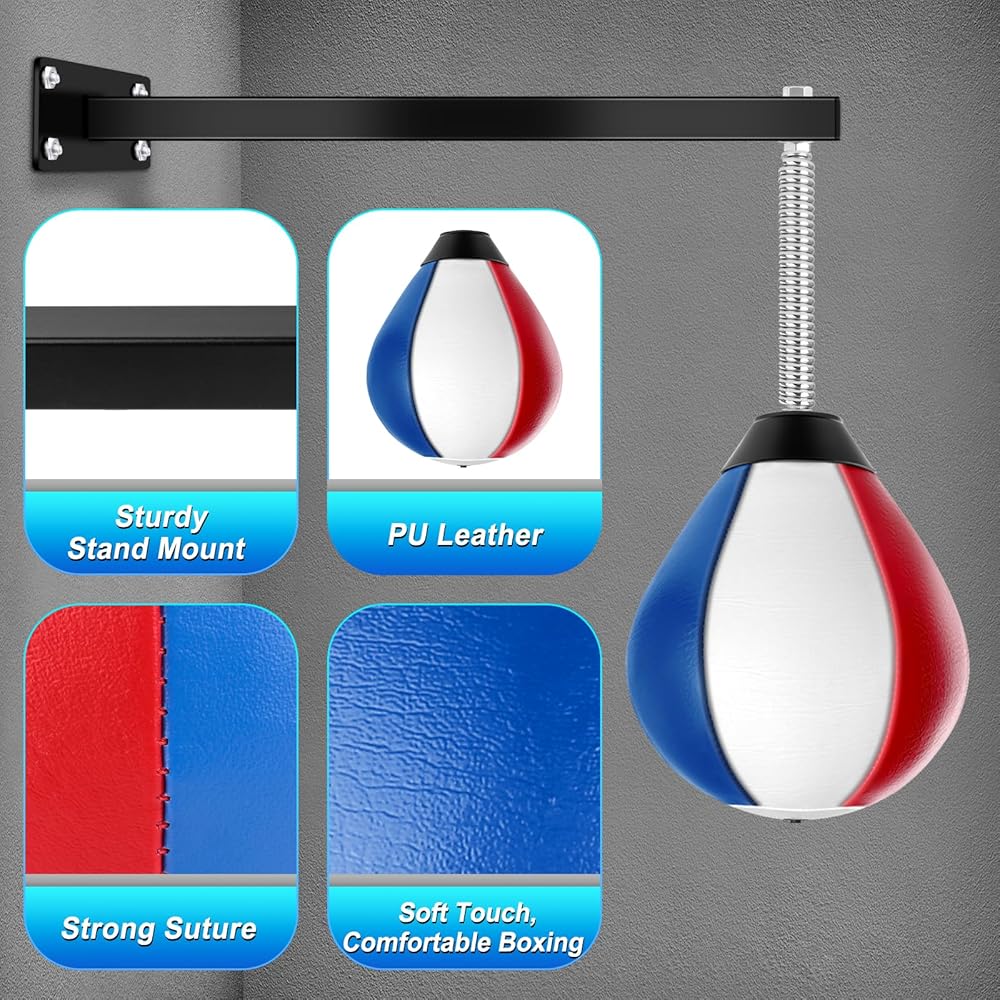 حقيبة سرعة عالية الجودة: حقيبة اللكم الجدارية المصنوعة من جلد البولي يوريثان مقاومة للاهتراء وناعمة، وتأتي مع حامل متين على جدار الملاكمة، ويمكن للينابيع المرنة للغاية العودة إلى وضعها الأصلي بسرعة بعد كل ضربة. تعطيك تجربة ملاكمة مريحة.
