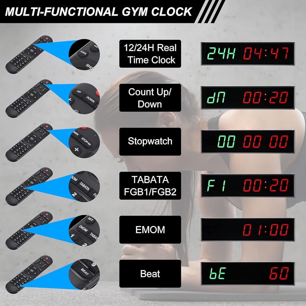 ساعة صالة الألعاب الرياضية متعددة الوظائف: يتضمن مؤقت التمرين الخاص بنا عرض ساعة 12/24 ساعة، وساعة إيقاف، ومؤقت الهدف، والعد التنازلي، ومؤقت فاصل زمني مخصص، و3 مجموعات من التوقيت المحدد مسبقًا (تاباتا، إيموم، FGB)، وظيفة العرض، بدون سلك تحكم عن بعد في غضون 10 أمتار (2 × بطاريات AAA غير متضمنة)، صوت طنين. يرجى الرجوع إلى دليل المستخدم لمعرفة الاستخدام المحدد ومقدمة الوظيفة.