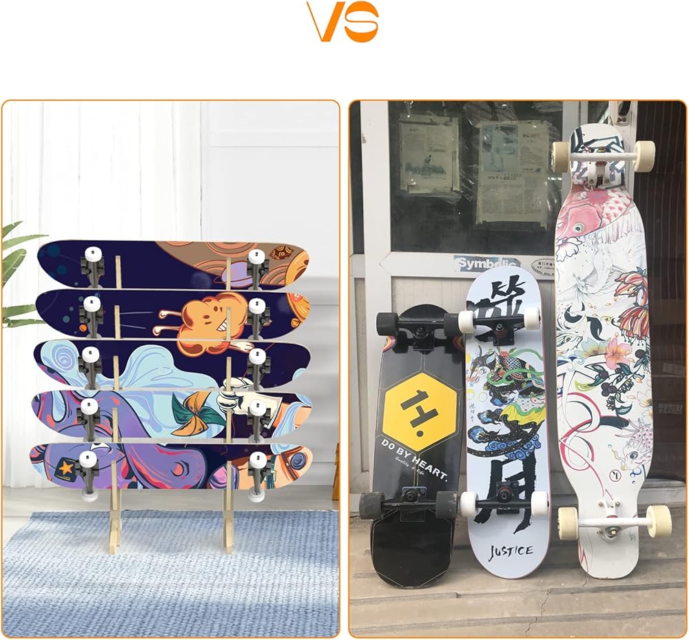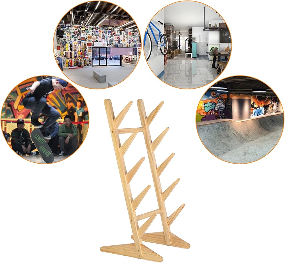 مواد متينة - رف لوح التزلج الخاص بنا مصنوع من خشب الصنوبر الطبيعي السميك عالي الجودة، وهو خفيف ومتين في نفس الوقت. السطح الخشبي مصقول جيدًا ولن يؤذي لوح التزلج الخاص بك. عملية رش الورنيش تجعل رف لوح التزلج هذا حرًا بنفسك. يمكنك تخصيصه بالكامل وفقًا لاحتياجاتك. قم بتغييره حسب رغبتك.