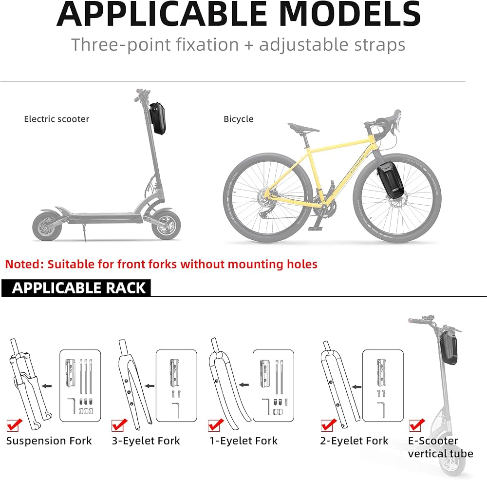 متعددة الأغراض: تتميز حقيبة منظم سكوتر بسعة كبيرة 4 لتر. إنها مناسبة للدراجات البخارية، والدراجات البخارية ذات الدواسات، والدراجات البخارية المثيرة، والدراجات البخارية ذاتية التوازن، والدراجات القابلة للطي. نحن نضمن أنه في حالة وجود أي مشكلة في الجودة مع حقيبة المنظم، فسنعيد إرسالها أو نعيد إليك أموالك، حتى تتمكن من تجربتها بثقة. ملاحظة: بالنسبة للشوكات التي لا تحتوي على فتحات تثبيت.