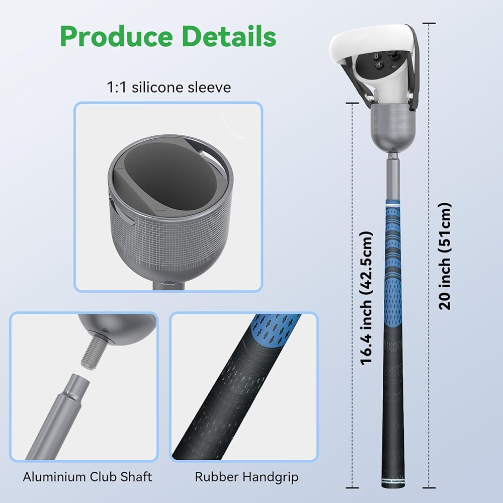 سبائك الألومنيوم - ملحق الجولف الواقع الافتراضي مصنوع من مادة سبائك الألومنيوم عالية القوة، وهي متينة وأنيقة. المقبض مغطى بمقبض من السيليكون، مما يجعلك تشعر وكأنك تحمل نادي جولف حقيقي.