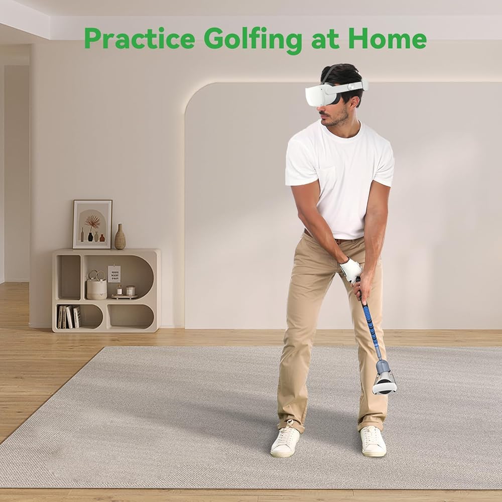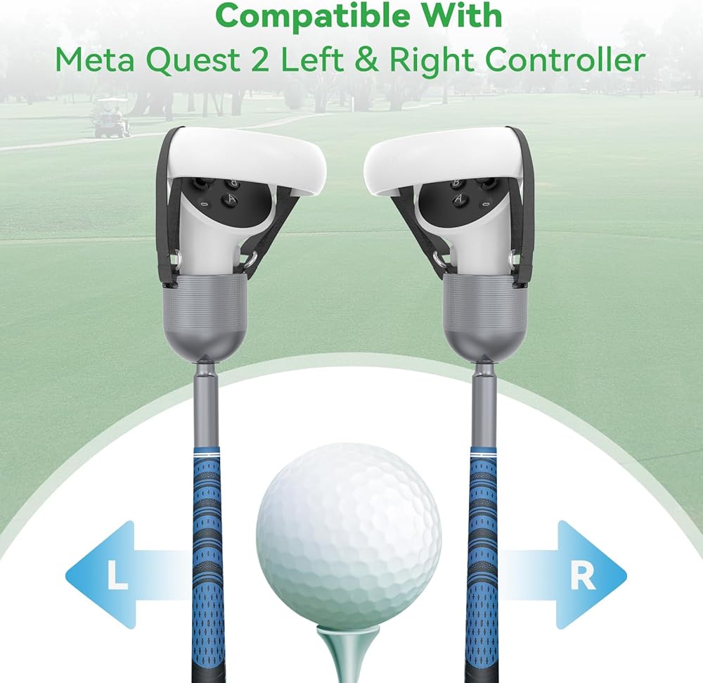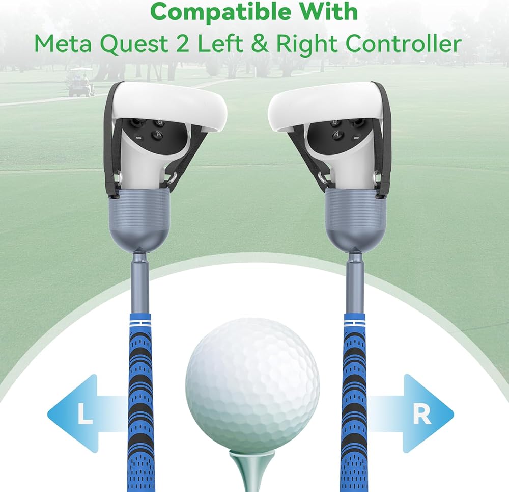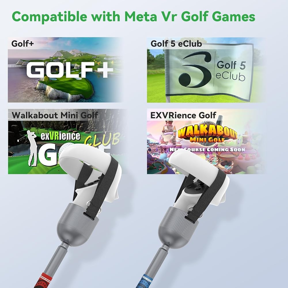 الألعاب والإعدادات المتوافقة - تتوافق ملحقات الغولف Quest 2 مع Golf+ وGolf 5 eClub وWalabout Mini Golf وexVRience Golf Club وألعاب الجولف الأخرى. تتطلب بعض الألعاب التخصيص، مثل Walkabout Mini Golf، والتي تحتاج إلى ضبط زاوية المضرب على 48 درجة؛ يمكن للعبة Golf+ اختيار نوع وحدة التحكم VR مباشرة في الإعدادات، ما عليك سوى اختيار نوع وحدة التحكم المماثل.