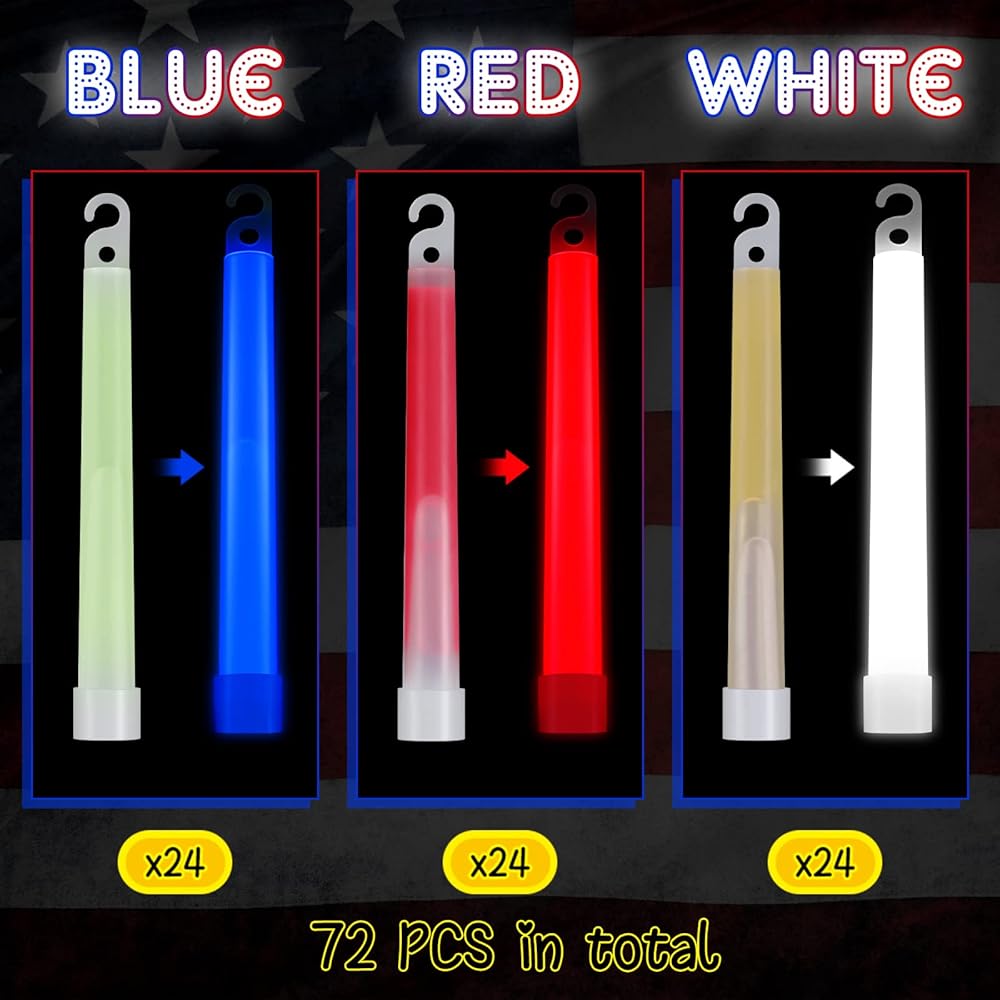 72 قطعة من عصي التوهج الوطنية باللون الأحمر والأبيض والأزرق من LEIFIDE مقاس 6 بوصات للمشي لمسافات طويلة وعصي توهج للطوارئ السائبة وعصي مضيئة لحفلات الرابع من يوليو والمسيرات والهدايا