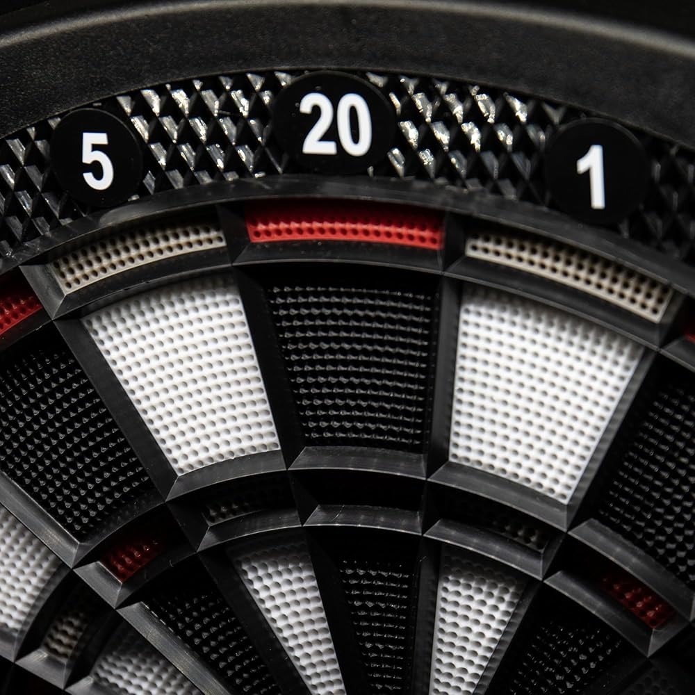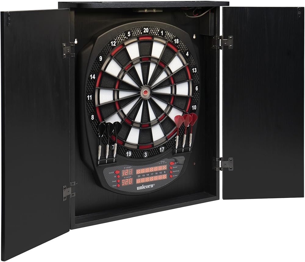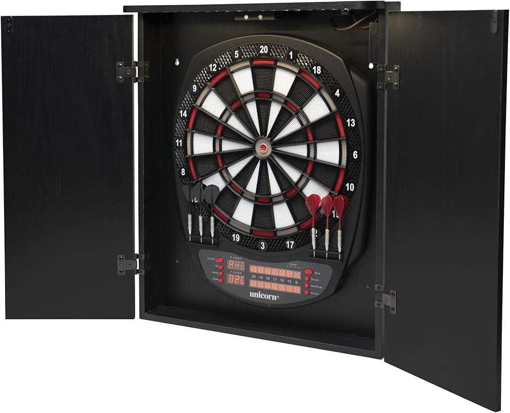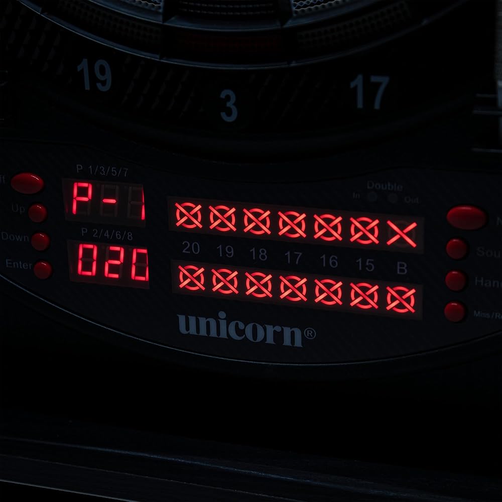 مجموعة خزانة لوحة السهام الإلكترونية LED من Unicorn Impact - مصابيح LED منشطة للباب - شاشات عرض LED مزدوجة مع علامات الكريكيت - تتضمن 6 سهام ذات أطراف ناعمة ونصائح بديلة