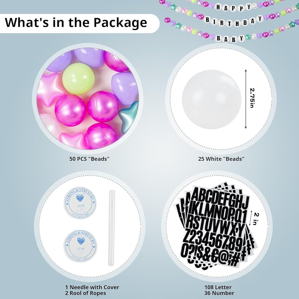 تشمل العبوة - تتضمن 50 كرة بلاستيكية (2.2 بوصة/5.5 سم)، 30 كرة بلاستيكية بيضاء (2.75 بوصة/7 سم)، 4 أوراق كاملة من ملصقات الحروف السوداء، وإبرة خياطة، و164 قدمًا/50 مترًا من خط السمك الشفاف. مثالية لجميع احتياجات ديكور الحفلات التي تحمل طابع المغني.