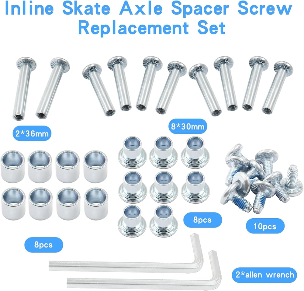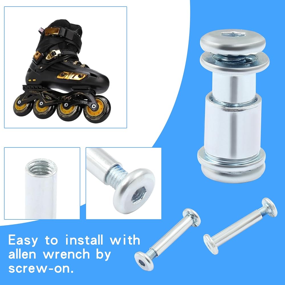 Inline skate screws and axles for roller skates, skates wheels fixing quickly and easily. Solid and durable skate wheel socket screws provide smoothly rolling experience. Effective and convenient to solve the problem and fix the inline skating and roller skating wheels easily.