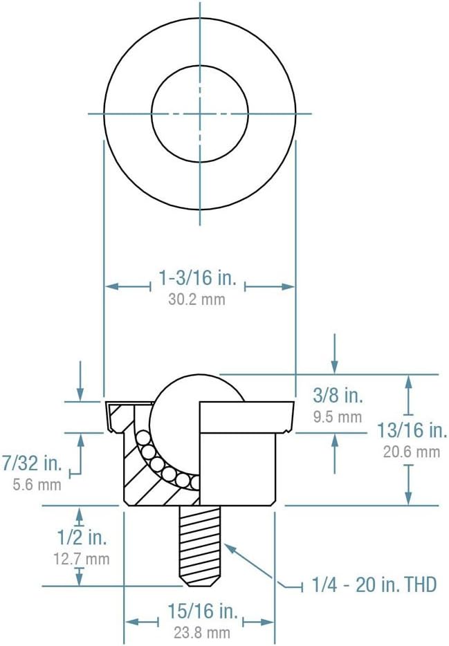Hudson Bearings stud mounted machined ball transfer. Solid machined cup with integral 1/4"-20 threaded stem. Hardened and plated for longevity. 5/8-inches main ball rotates on 3/32-inches support balls. Carbon steel housing material. Carbon steel units are sealed and lubricated to ensure maximum life, unless otherwise specified. 33 pounds load capacity. Common applications: air cargo, shears, robotics, military logistics, store fixtures, die handling, laser and plasma cutters, glass and metal manufacturing, medical devices, caster substitution.