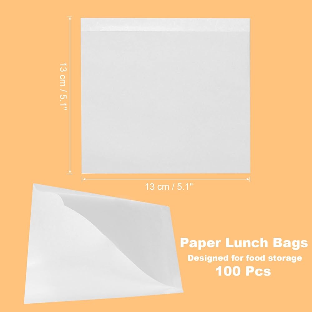 The package comes with 100 white kraft paper bags, each kraft bag measures about 13 x 13 cm / 5.1 x 5.1 inch (L*W). The size can be used for many kinds of cookies, sandwiches, breads, and snacks.