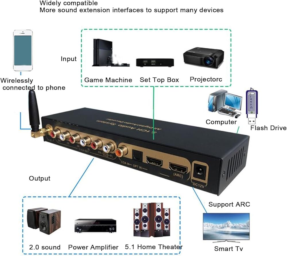 2. Wide Compatibility: Through 5.1 channel or 2.0 channel output, fully compatible with all power amplifier or active sound equipment on the market, including DVD players, BD player, network players, set top boxes, for PS3, for Xbox 360, PC, home theater, cars and many other entertainment devices.