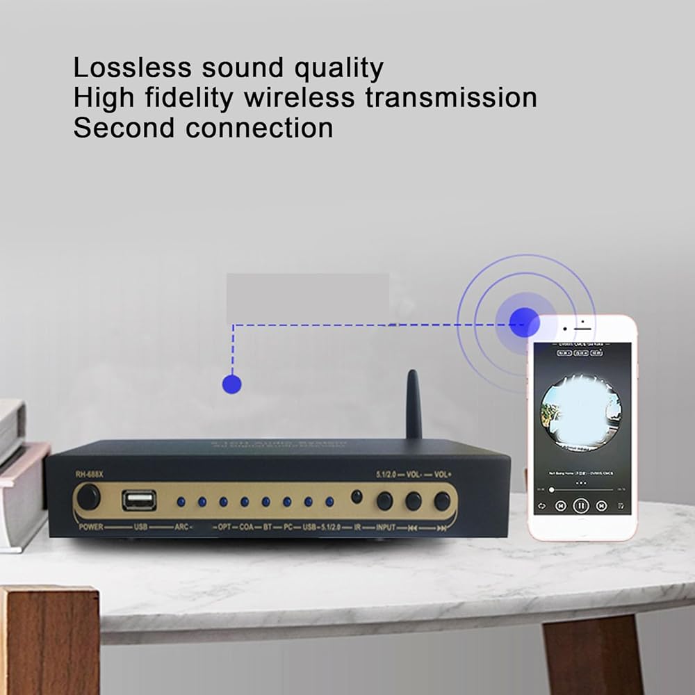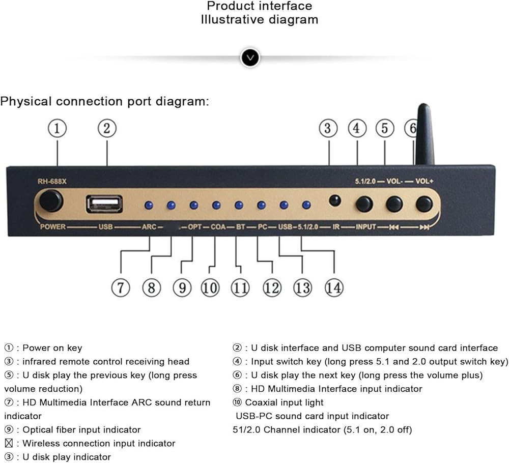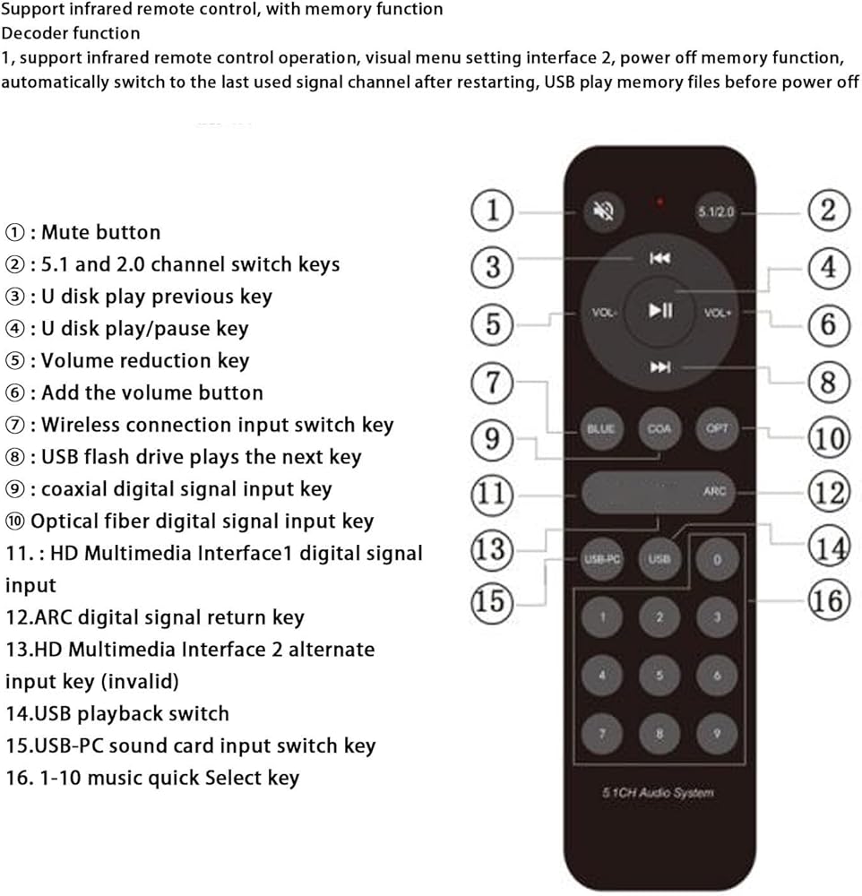 1. Sound Decoding System: Used to decode for Dolby AC?3, LPCM and other digital sound format source code, support U disk playback DTS, AC3, WAV, FLAC, APE, MP3 and other sound. Support HD multimedia interface input source sound decoding, ARC return, fiber optic and coaxial input decoding, Bluetooth 5.0, USB playback and computer USB sound card, mobile OTG.