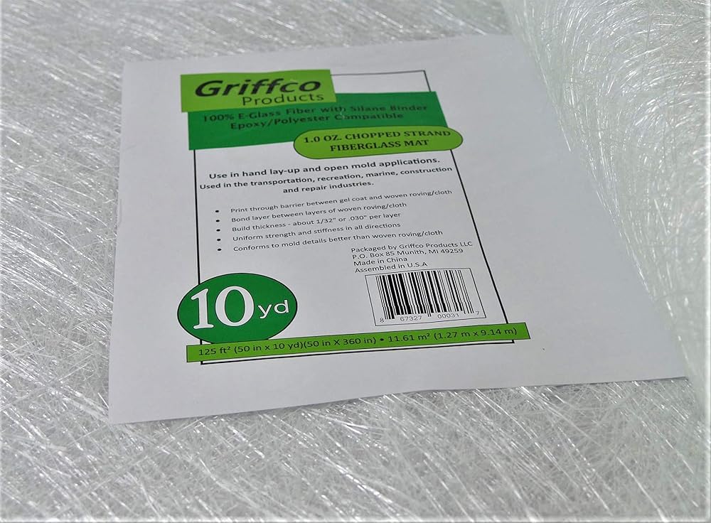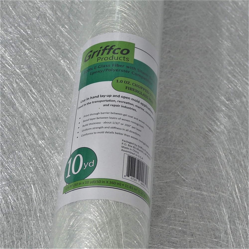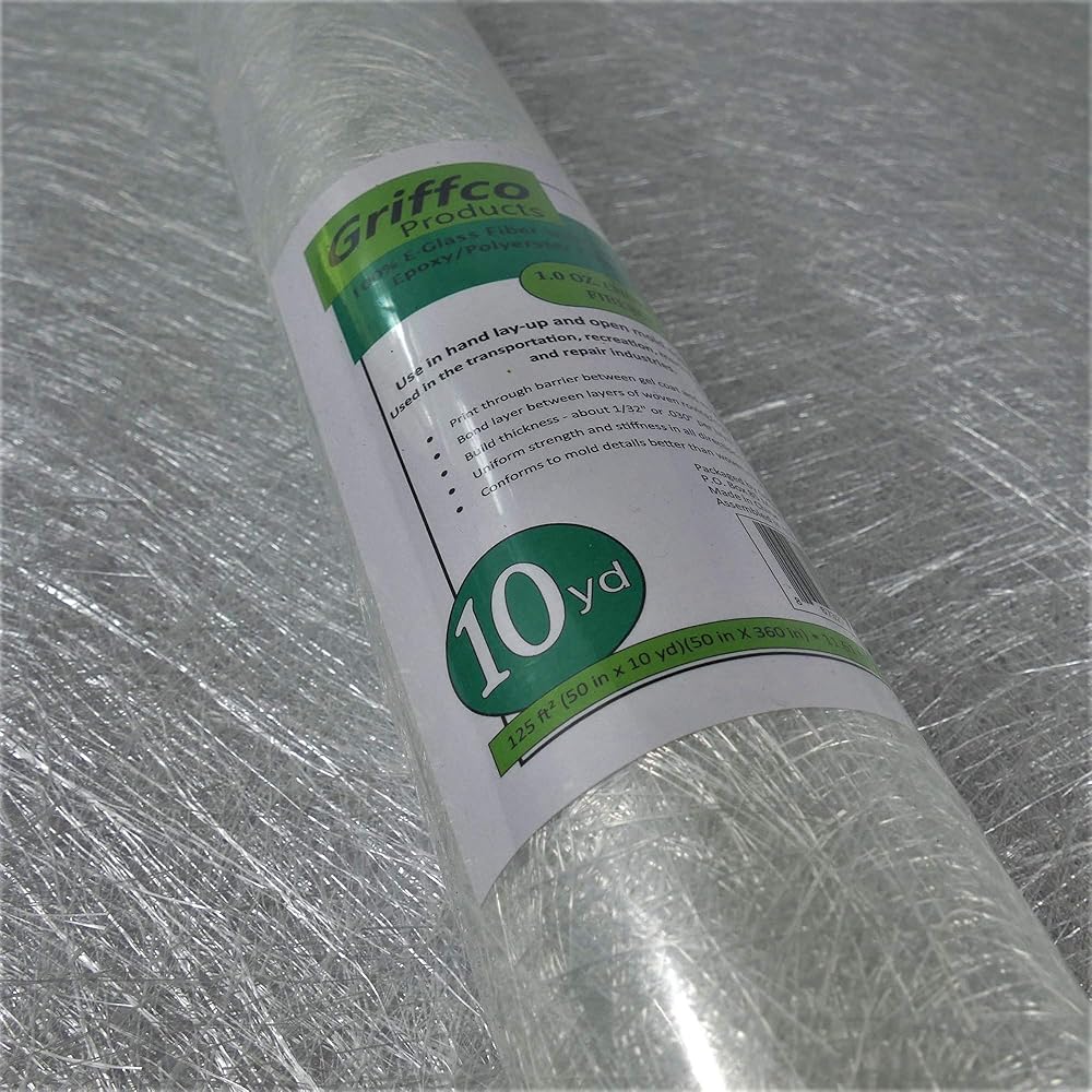50" wide, continuous 10 yard linear length. Rolled and packaged as shown in pictures. Can be used in a variety of hand lay-up applications with epoxy, polyester and vinyl ester resins. Used in the transportation, recreation, marine and construction industries.