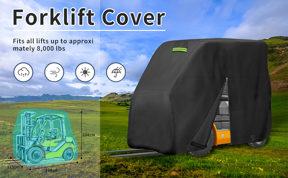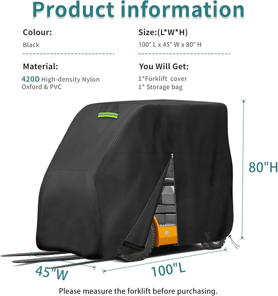 • توافق الحجم: غطاء الرافعة الشوكية مناسب لجميع المصاعد التي تزن حوالي 8000 رطل. الأبعاد: 100 بوصة طول × 45 بوصة عرض × 80 بوصة ارتفاع. الغطاء الخاص بنا أكبر بمقدار 3-5 سم من معظم الأغطية المقاومة للماء المتوفرة في السوق، مما يوفر حماية أفضل لسيارتك. (يرجى التأكد من المقاس قبل الشراء).