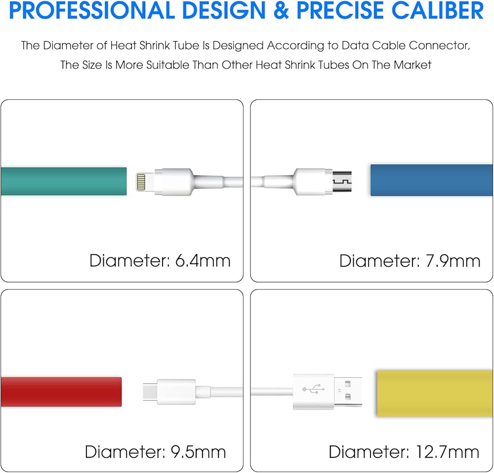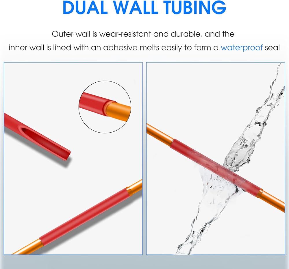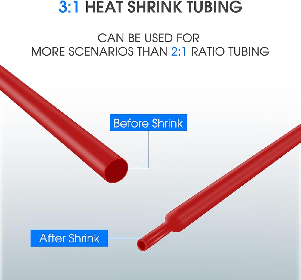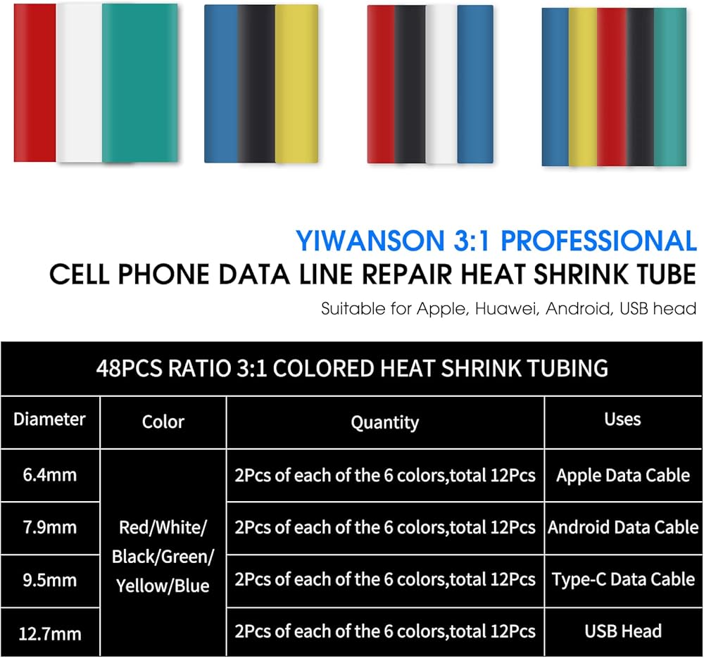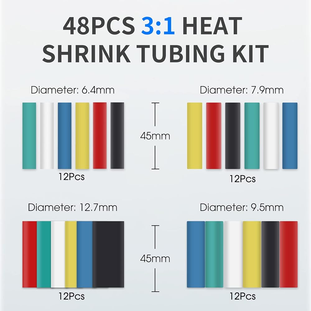 🌄YIWANSON Dual-Wall Ratio 3:1 Colored Marine Grade Industrial Electrical Waterproof Wire Shrink Wrap Tubing With Adhesive Sleeves Insulation Multicolor Large Tubing Kit Specification:Material: PolyolefinQuantity: 48pcsLength: 1.77"(4.5cm)Diameter: 6.4mm, 7.9mm, 9.5mm, 12.7mmShrinkage Temp: 70℃Full Shrinkage Temp: 125℃maximumTensile strength: 10.4MpaFeature:Safe & ECO-Friendly: Heat shrink tubes are made of high quality Polyolefin, electrical insulation, corrosion resistance and high temperature resistance, long-lasting, they are also RoHS Compliant, protect you and your famaily from toxins.DIY Helper: Multiple sizes heat shrink tubing for your choose, they can be used for solder joint protection, group of lines marking, resistance electric capacity reason protection etc. Easy to Use - Simply slide heat shrink tube over your connection point and apply heat. Professional connections made in seconds. Grouping loose wires, creating thermal insulation for heat sensitive components,protecting surfaces against abrasion, peeling, and denting.Package includes:🌟12pcs x 6.4mm. Black, Green, Blue, Red, Yellow, White each 2Pcs.🌟12pcs x 7.9mm. Black, Green, Blue, Red, Yellow, White each 2Pcs.🌟12pcs x 9.5mm. Black, Green, Blue, Red, Yellow, White each 2Pcs.🌟12pcs x 12.7mm. Black, Green, Blue, Red, Yellow, White each 2Pcs.🌟Total: 48Pcs Waterproof Heat Shrink TubingHow to use it? 1. First choose the right size tubes, as it is 3:1 heat shrink ratio, and will shrink up to 1/3 of original diameter. 2. Wrap the cable wire with the tube, then use a heat machines heating it until the wire was wrapped tightly. 3. Don't touch the tube until it becomes cool. If there is a problem, you can heat it again to correct it.
