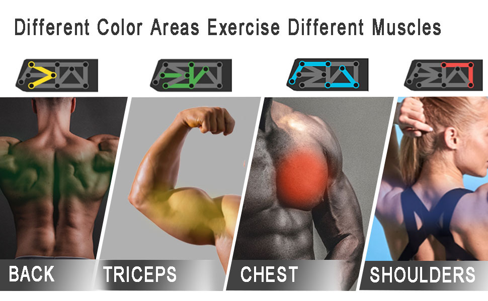 【أربعة مجالات رئيسية، تدريب دقيق لمجموعات العضلات المختلفة】أربعة مناطق رئيسية، 41 طريقة للضغط، تساعدك على التدريب بشكل علمي ودقيق، وهي مساعد جيد لاكتساب العضلات. المنطقة الزرقاء تدرب عضلات صدرك، والمنطقة الحمراء تدرب كتفيك، والمنطقة الصفراء تدرب ظهرك، والمنطقة الخضراء تدرب العضلة ثلاثية الرؤوس.