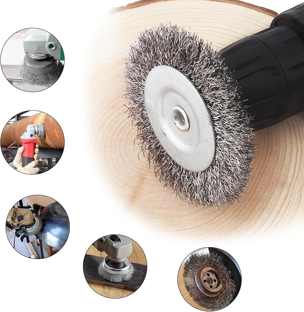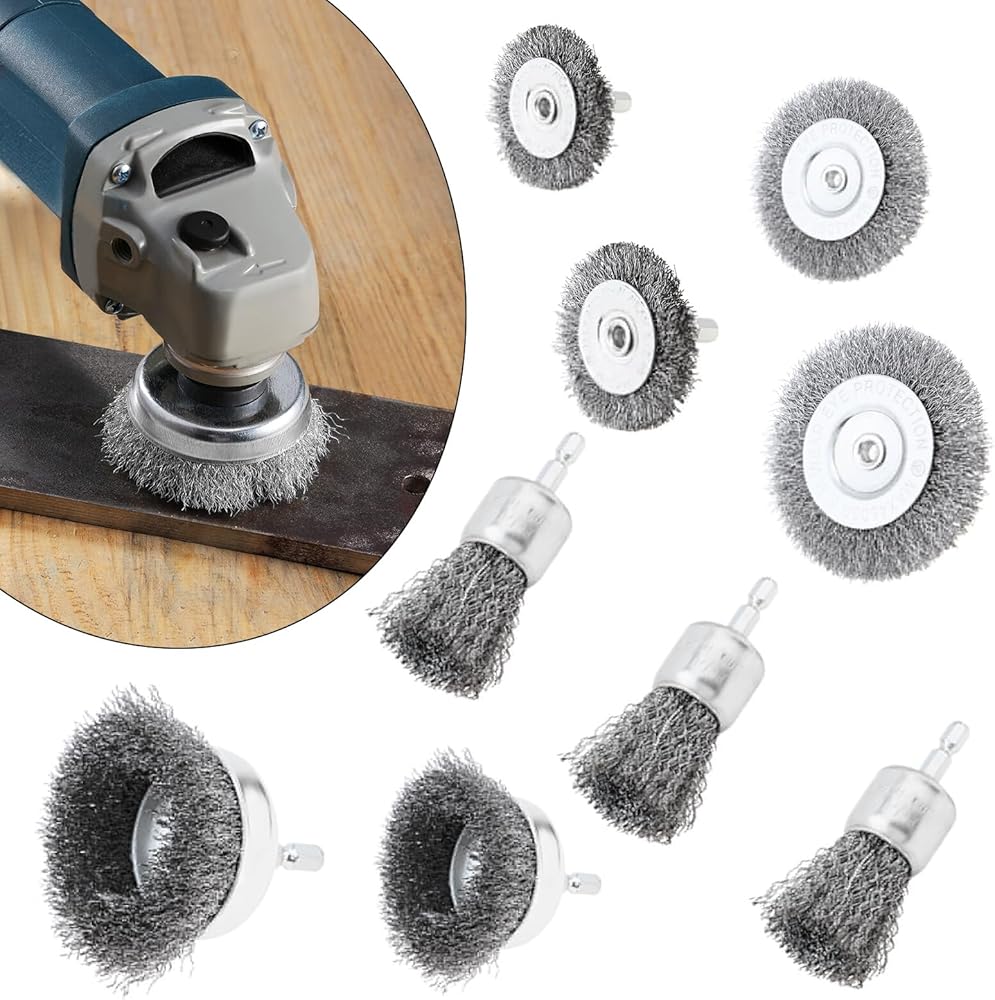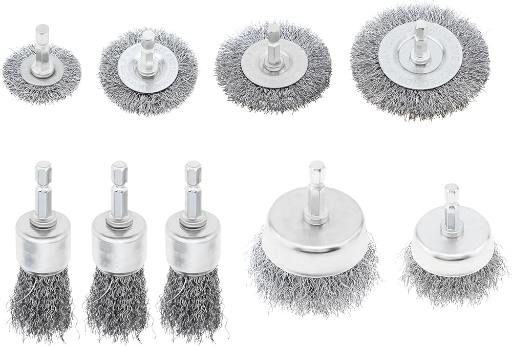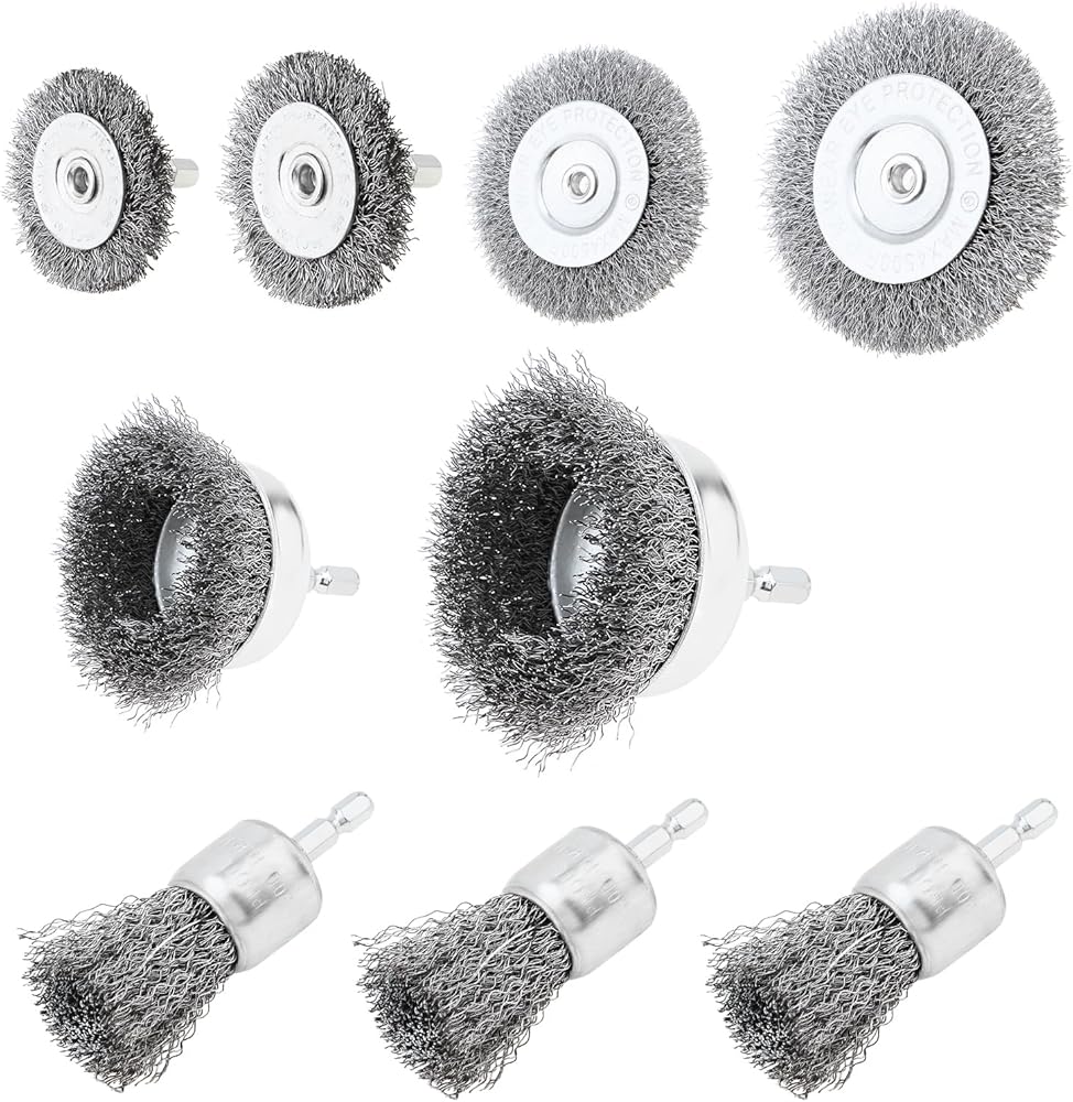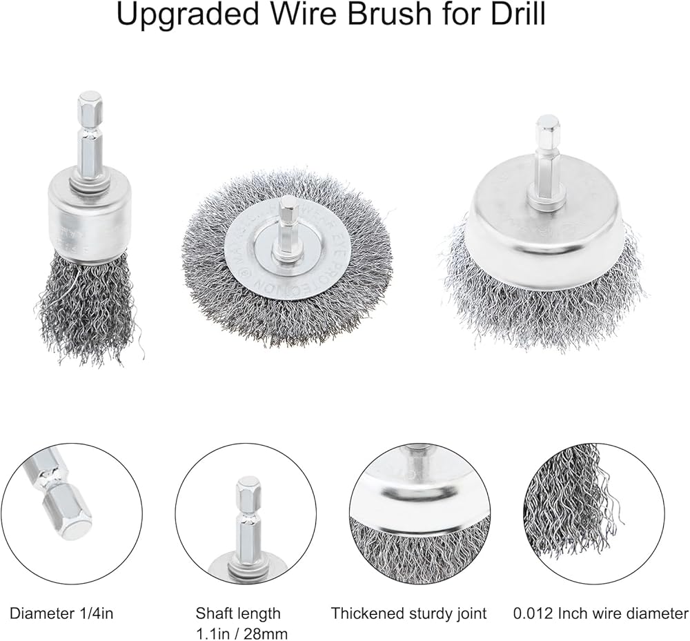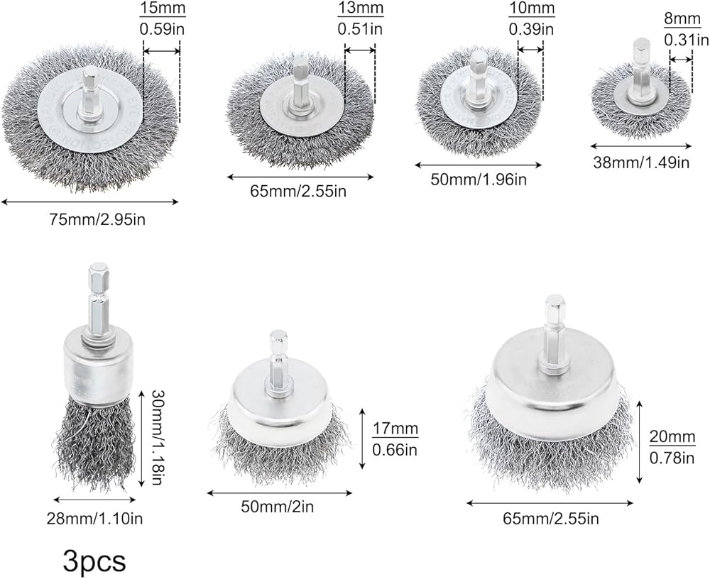 Package Includes: Drill wire brush set of 7 different diameters. 4pcs wheel shaped steel wire brush, 2pcs cup shaped steel wire brush, 3pcs pen shaped steel wire brush