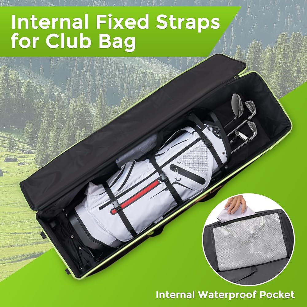 تخزين آمن للجولف: سافر بذكاء مع حقيبة سفر الجولف الخاصة بنا، المصممة لتوفير الأمان والراحة. يتميز بجيب كبير للأحذية، وجيبين جانبيين، وحجرة رئيسية تفتح 180 درجة بثلاثة أشرطة لتأمين الأندية الخاصة بك. بالإضافة إلى ذلك، تحتوي على جيب داخلي مبلل، مثالي لتخزين الملابس المبللة. حقيبة الجولف للسفر هذه هي الرفيق المثالي للمسافرين الدائمين، وتوفر التوازن المثالي بين التخزين والحماية لمعداتك.