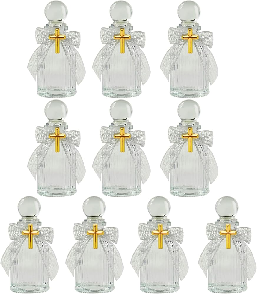 10 مجموعة من زجاجات المياه المقدسة 50 مل من الزجاجات المسيحية الكاثوليكية مع 10 قطع من دبابيس طية صدر السترة المتقاطعة و10 قطع من القوس الدانتيل لهدايا المناولة المقدسة، حاوية فارغة لحفلات الزفاف في الكنيسة