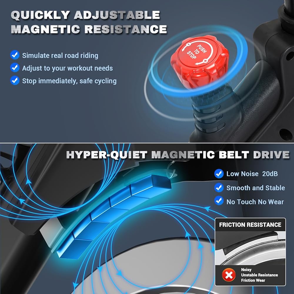 نظام قيادة الحزام فائق الهدوء: على عكس الدراجات الخادعة ذات العجلات الرملية الحديدية المزعجة، وتساقط الحزام ومشاكل كسر البكرة، تستخدم دراجة التمرين بكرات عالية القوة، ومحامل من الدرجة الصناعية ومقاومة مغناطيسية مطورة لخلق رحلة سلسة وصامتة بشكل لا يصدق، مثالية للتدريبات الداخلية. العمل والقراءة والنوم في المنزل دون انقطاع.