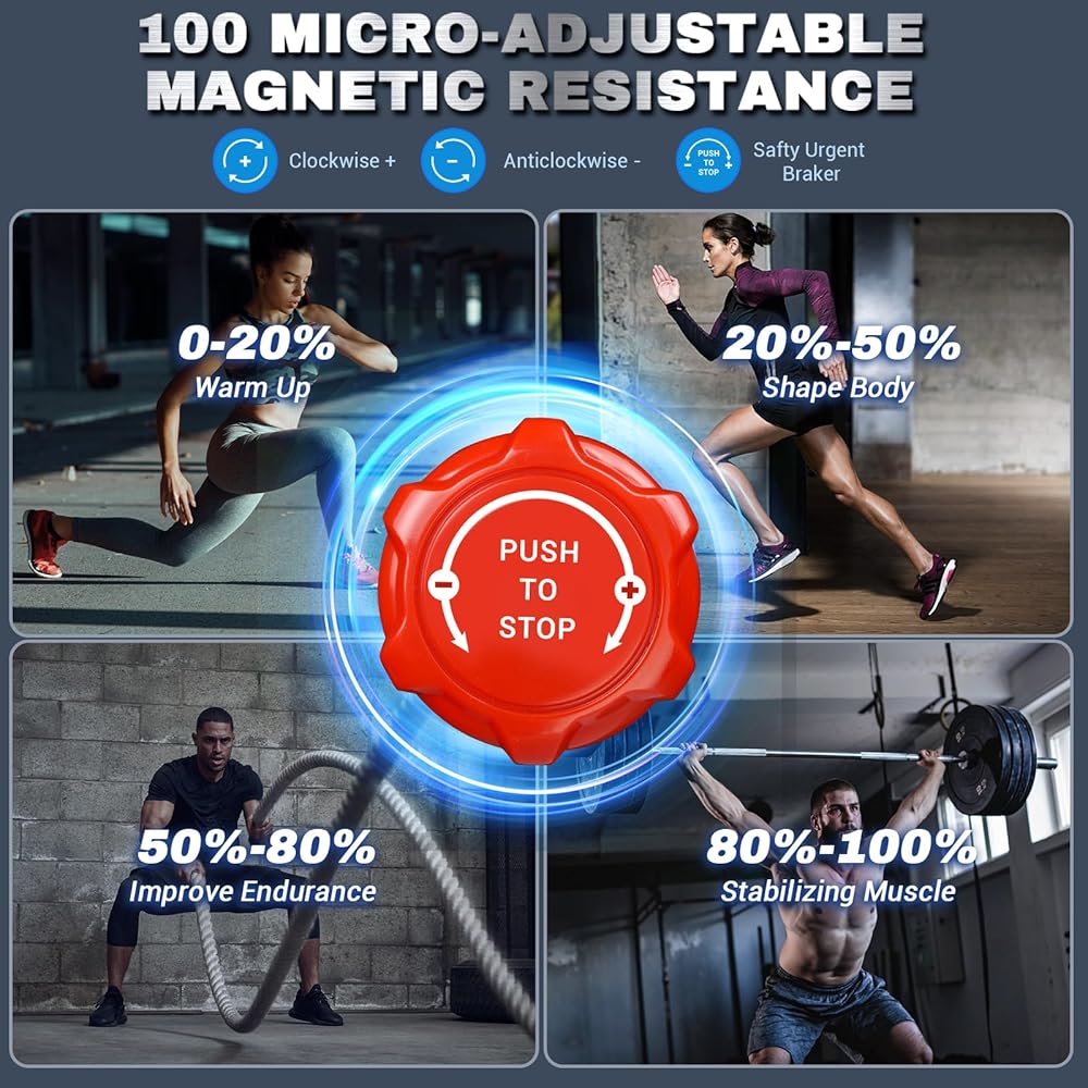 مقاومة مغناطيسية قابلة للتعديل 100 ميركو: مقاومة مغناطيسية مع 100 مستوى قابل للتعديل الدقيق، ما عليك سوى تشغيل المقبض لزيادة أو تقليل التعديل إلى المستويات المختلفة التي تناسبك. اضغط على نفس المقبض للتوقف بسرعة وأمان. عملية مريحة تجعل الحركة أكثر بساطة وكفاءة.