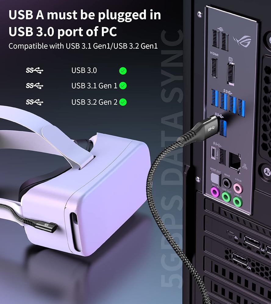 ⚡[نقل USB3.0 عالي السرعة]: يدعم هذا الكابل سرعة نقل USB 3.0. توفر لك مزامنة البيانات المستقرة والسريعة التي تعمل مع تيار مستمر وموثوق تجربة ألعاب VR سلسة. يعمل شريط الفيلكرو المرفق على إصلاح الكابل وQuest2/Pico Neo 4 لمنع انقطاع الاتصال أثناء الحركة. ملاحظة: عند الاتصال بجهاز الكمبيوتر الخاص بك، يرجى إدخال كابل USB 3.0 هذا في منفذ USB A 3.1/ USB A 3.0.