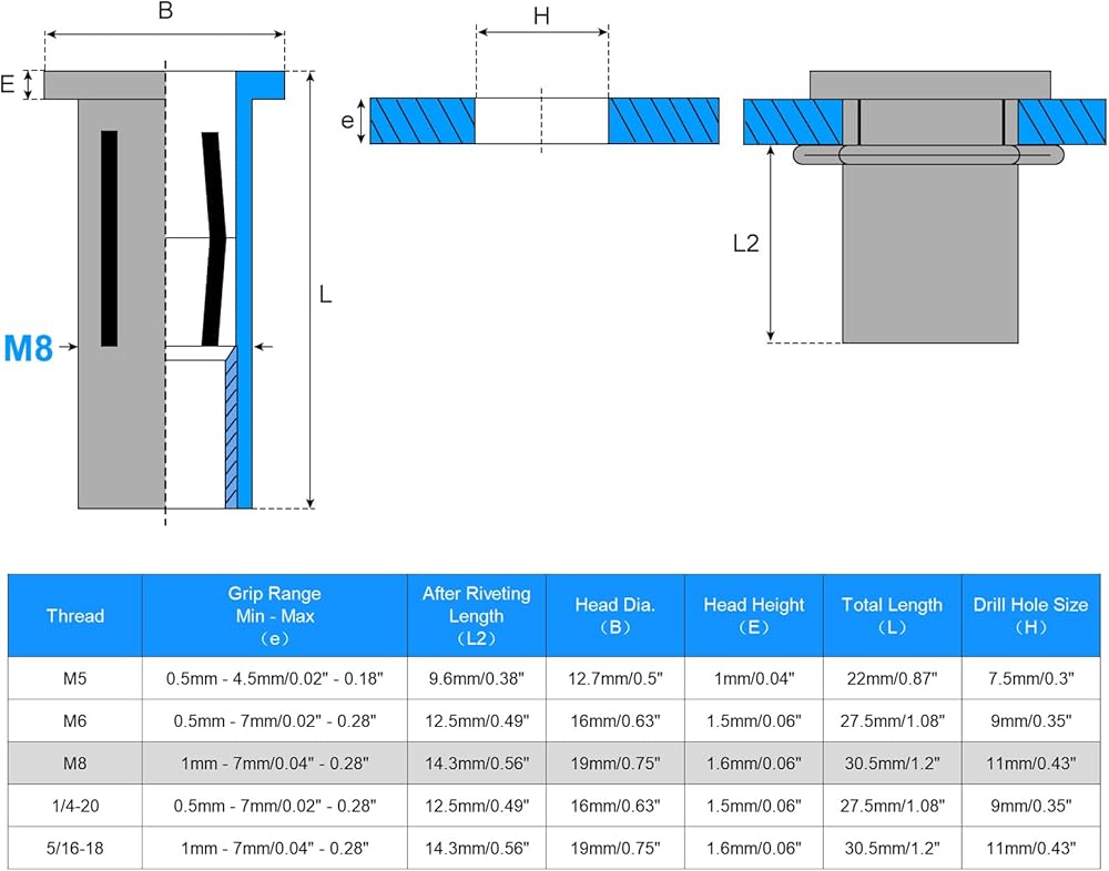 • صواميل البرشام: حجم الخيط: M8 × 1.25 مم؛ الطول الإجمالي: 30.5 ملم / 1.2 بوصة؛ حجم الرأس: 19 × 1.6 ملم / 0.75 بوصة × 0.06 بوصة (عمق × ارتفاع)؛ قطر القضيب (حجم فتحة الحفر): 11 ملم / 0.43 بوصة؛ الطول بعد التثبيت: 14.3 مم / 0.56 بوصة؛ سمك لوحة البرشام: 1-7 مم / 0.04 بوصة - 0.28 بوصة؛