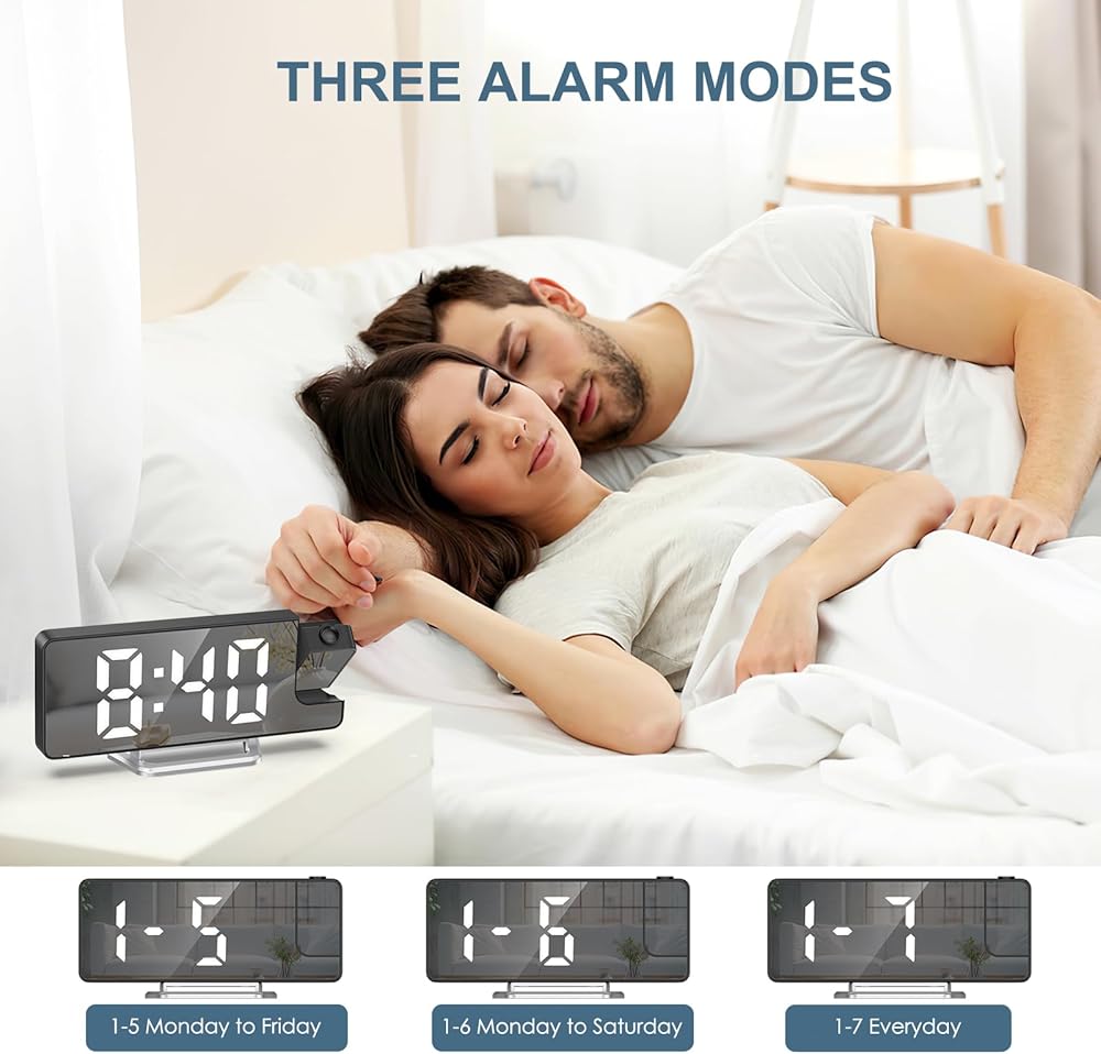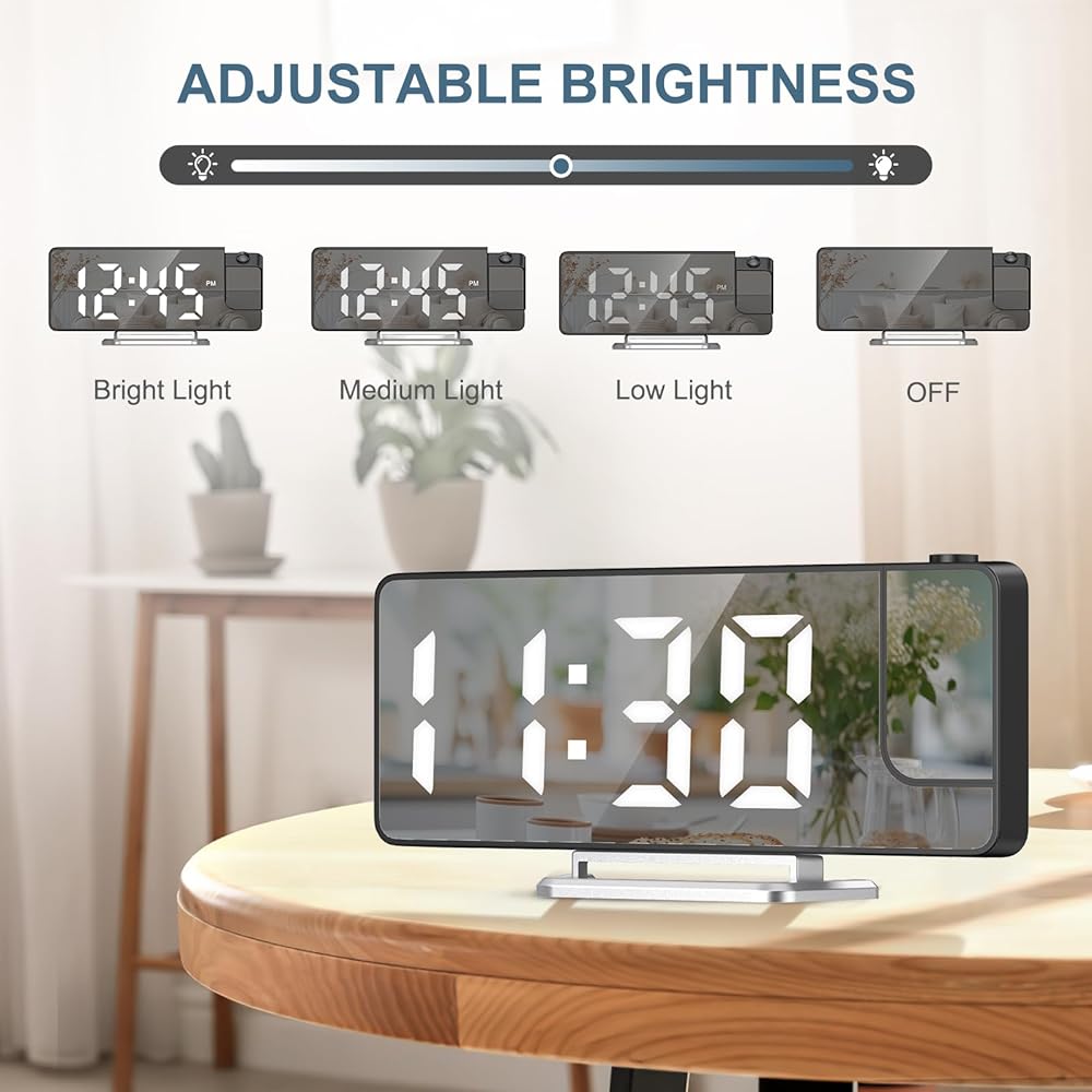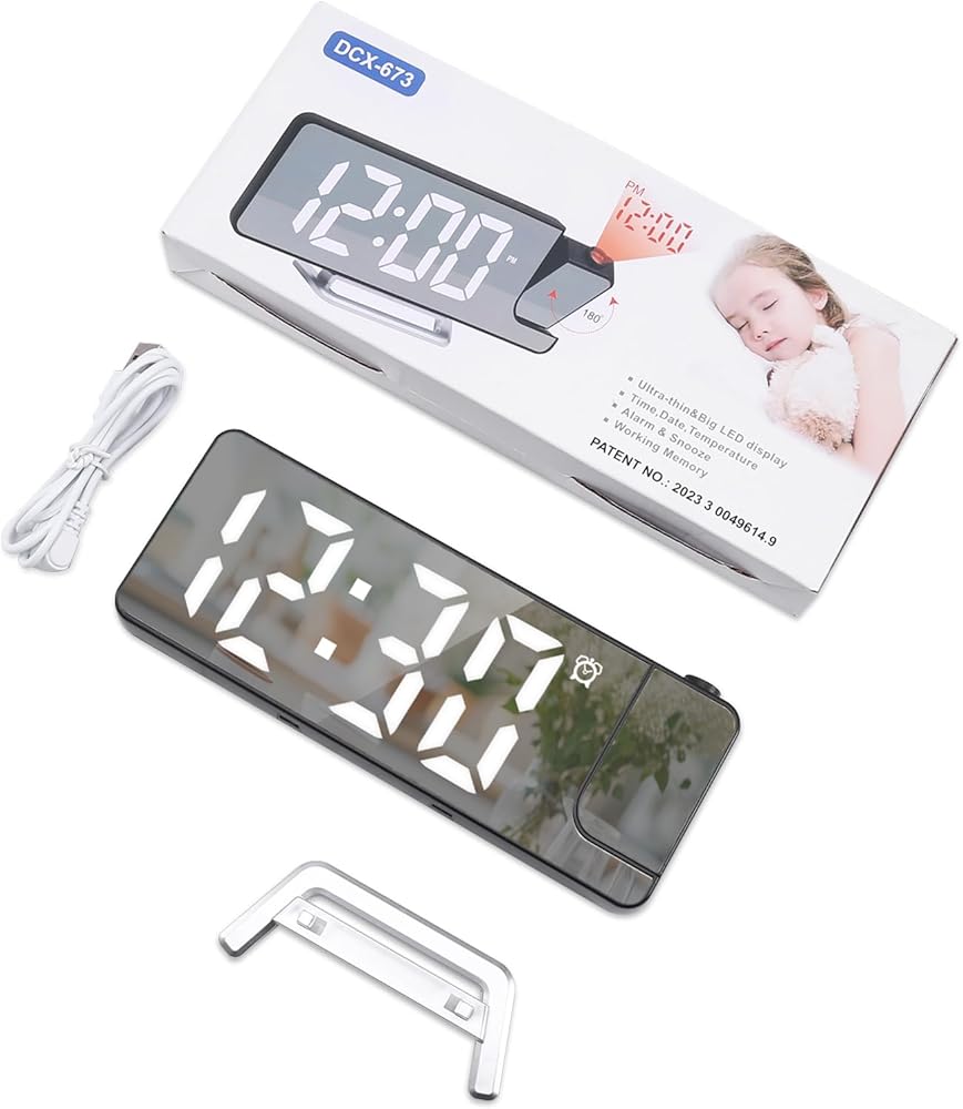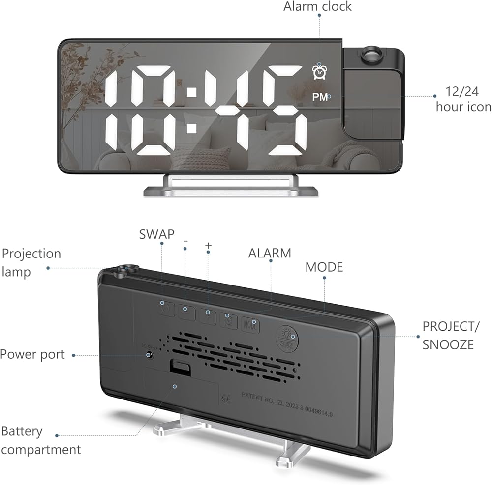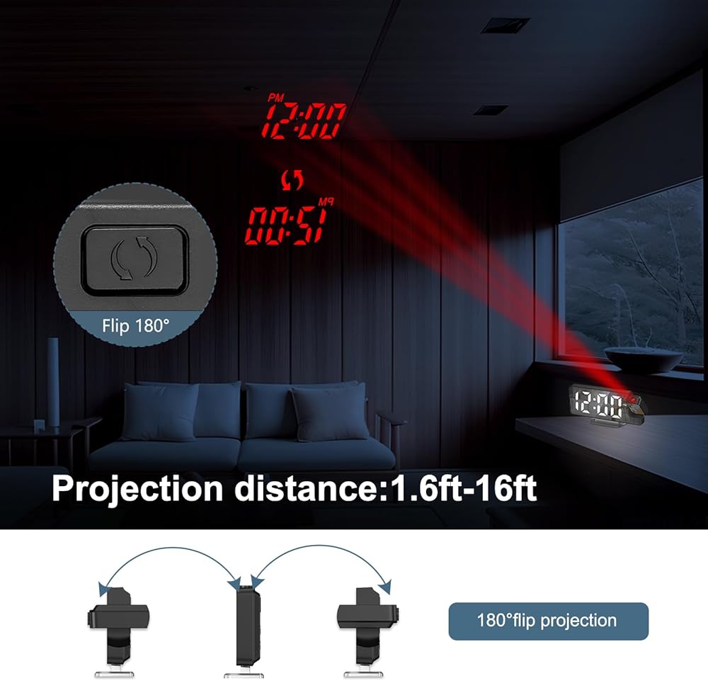شاشة عرض وجهاز عرض مقاس 7.9 بوصة: تتميز ساعة المنبه المرآة الرقمية بشاشة عرض LED مقاس 7.9 بوصة مع خط رقمي كبير. يدور جهاز عرض LED المحسن 180 درجة ويعرض ما يصل إلى 1.6-16 قدم، ويعرض الوقت بسلاسة على أي سطح.