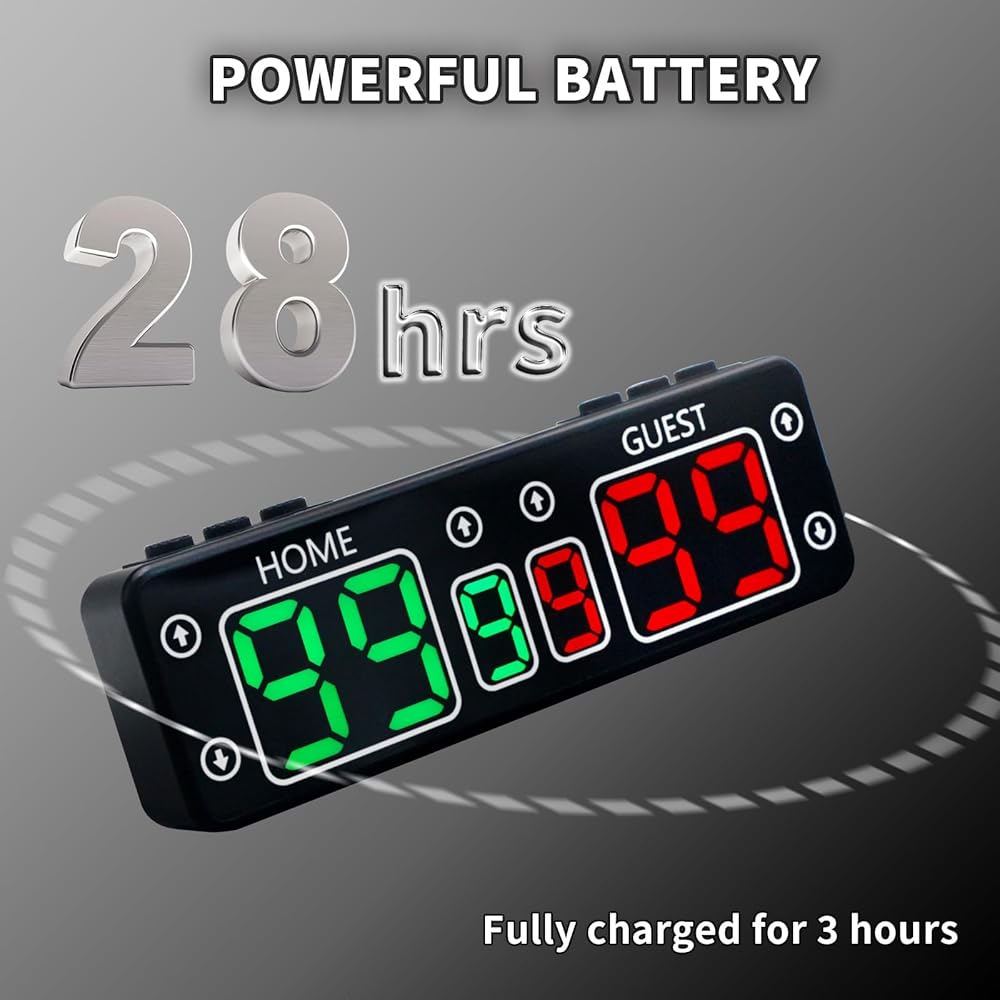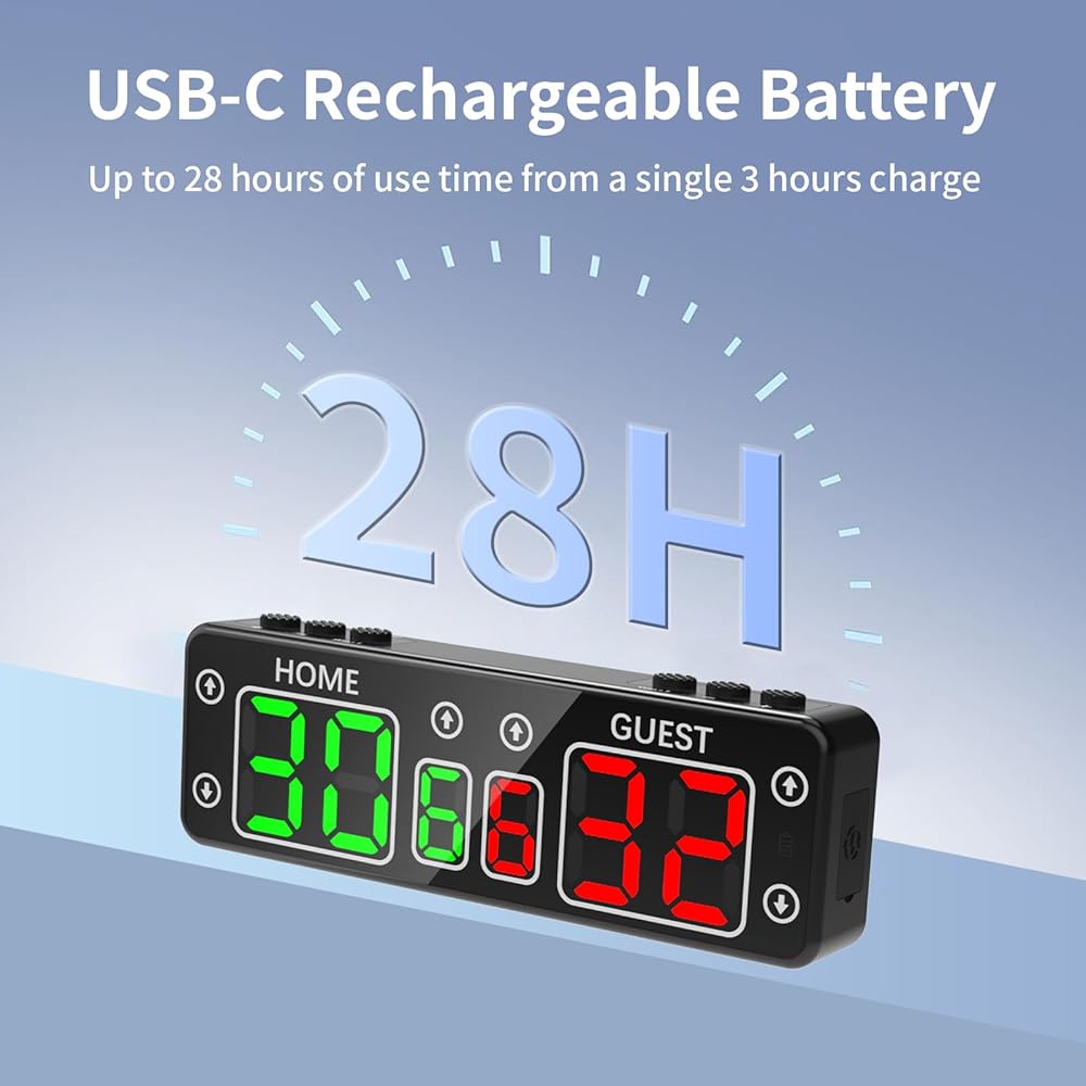 بطارية احتياطية طويلة وذاكرة انقطاع الطاقة: لوحة نتائج رقمية LED مع بطارية مدمجة قابلة لإعادة الشحن. 4 ساعات مشحونة بالكامل، يمكن أن تعمل بشكل مستمر لمدة تصل إلى 24 ساعة، مما يضمن عدم نفاد الطاقة أبدًا أثناء الأحداث الخاصة بك. يجب أن تتوقف اللعبة، وسوف تتذكر لوحة النتائج النتائج. لا تقلق بشأن فقدان النتائج عند نفاد البطارية. يتيح لك منفذ الشحن المريح من النوع C الشحن بسهولة باستخدام بنك الطاقة أو المقبس.