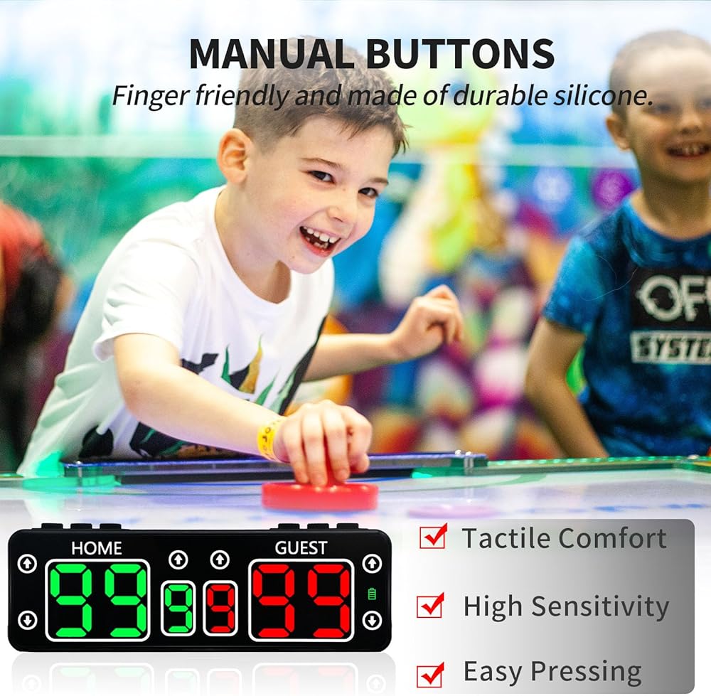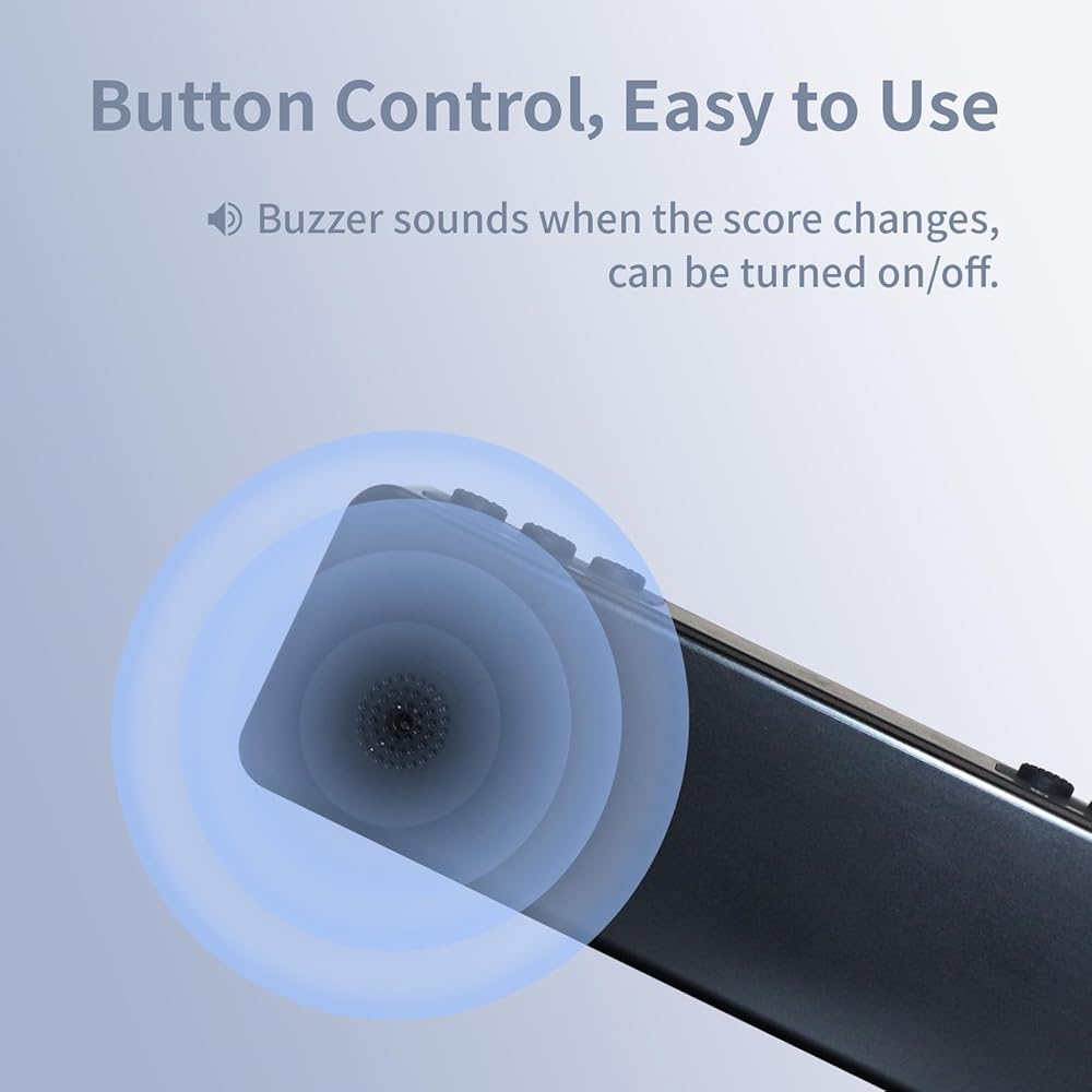 【أزرار يدوية سهلة التشغيل】: تتميز الأزرار الموجودة أعلى لوحة النتائج بلمسة مريحة وحساسية عالية. يمكنك أيضًا استخدام الأزرار الموجودة على لوحة النتائج للتحكم في النتيجة (0-99)؛ زيادة نتيجة المباراة (0-9)؛ تبادل الجانب إعادة ضبط الدرجات وضبط مستوى الصوت. الزر كبير الحجم وله تصميم مانع للانزلاق لمنع الضغط عليه عن طريق الخطأ.