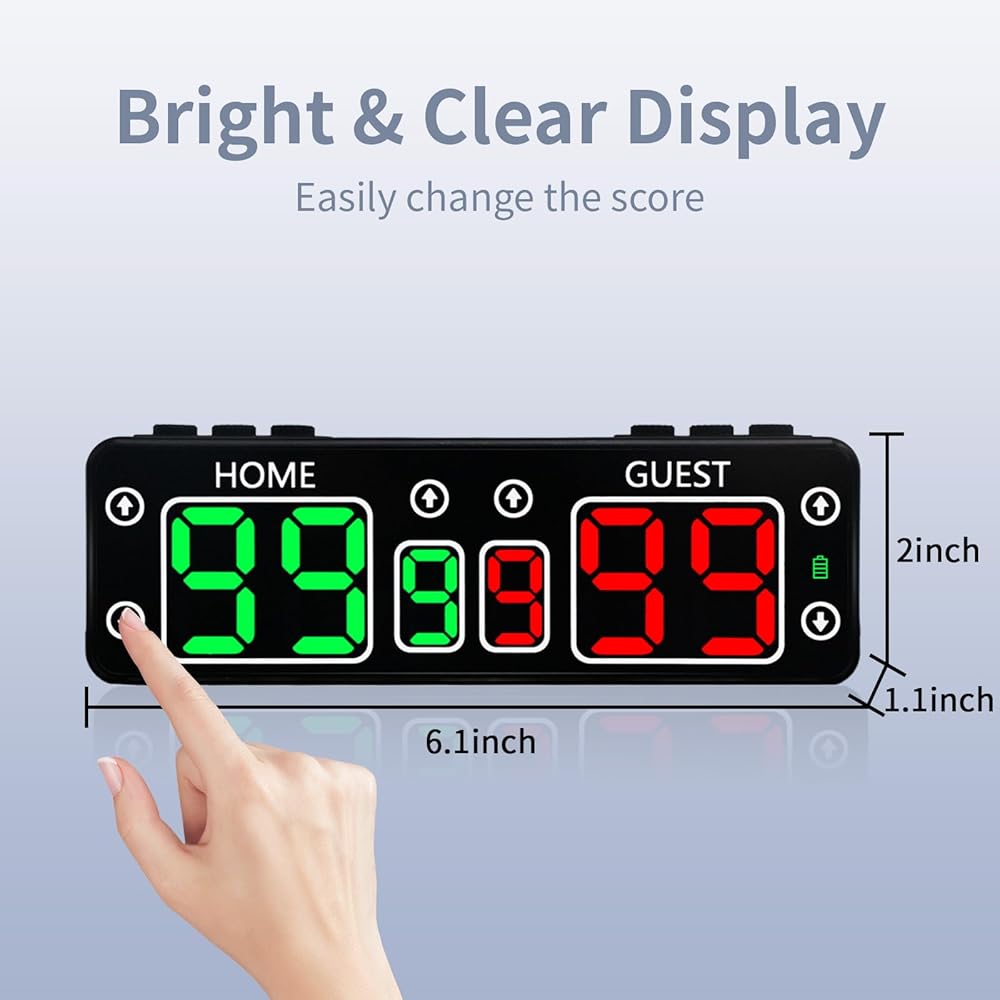【لوحة نتائج محمولة ومغناطيس قوي】: تم تصميم لوحة النتائج الخاصة بنا ليتم حملها بسهولة في حقيبتك أو جيبك، ويمكنك اصطحابها معك إلى الأحداث الرياضية أو المسابقات أو حتى التجمعات غير الرسمية. مع مغناطيس قوي يمكنك وضع لوحة النتائج بسهولة في أي مكان. دون أي مشكلة. عندما تتغير النتيجة، توفر لوحة النتائج تذكيرًا صوتيًا، مما يضمن أن الجميع على علم بتغيير النتيجة. يمكنك ضبط مستوى الصوت ليناسب البيئات والتفضيلات المختلفة.