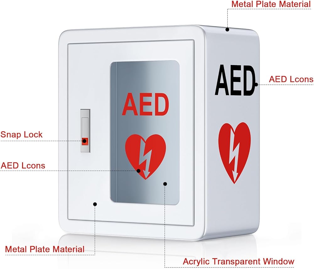 قفل سريع وفتح الباب - خزانة تخزين جهاز مزيل الرجفان AED مع قفل سريع، مع نافذة أكريليك شفافة للتعرف على جهاز مزيل الرجفان AED. نصيحة: خزانة AED باللون الأحمر بدون إنذار.