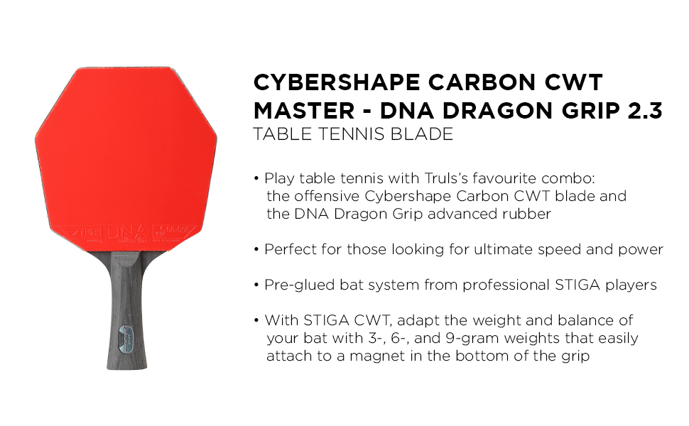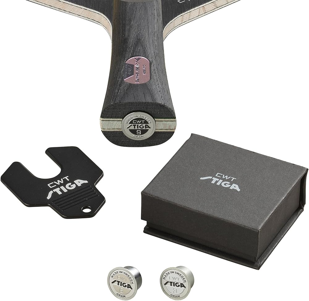 تقنية ألياف الكربون: إن Cybershape Carbon CWT عبارة عن شفرة مكونة من 5+2 طبقة تعتمد على تقنية CCF (الألياف الأساسية القريبة). يتم تطبيق طبقة ألياف الكربون مباشرة فوق قلب الخشب مما يوفر مزيدًا من التحكم وزيادة السرعة. كما أن ألياف الكربون خفيفة الوزن والمتقدمة تقنيًا تمنح الشفرة سرعة أكبر دون التضحية بالتوازن. مع STIGA CWT، قم بتعديل وزن وتوازن مضربك بأوزان 3 و6 و9 جرام يمكن ربطها بسهولة بالمغناطيس في الجزء السفلي من المقبض.