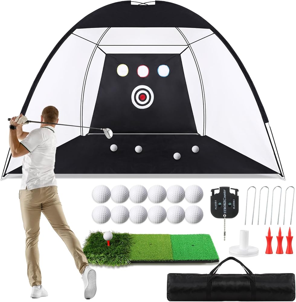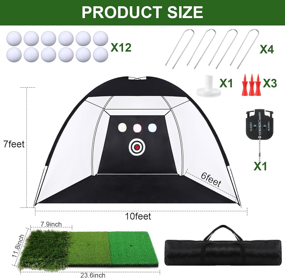 • All in One Golf Hitting Training Net: you will receive 1 set of golf practice net set, equipped with 4 golf tees, 12 golf balls, 4 ground hooks, 1 scorer, 1 golf hitting mat and 1 carry bag, this complete set can meet your needs for an immersive golf practice session; An outstanding way to practice every club in your golf bag easily at home, outdoor, saving money and time; A thoughtful and practical gift for men boys golf lovers, beginner