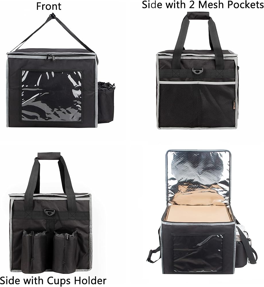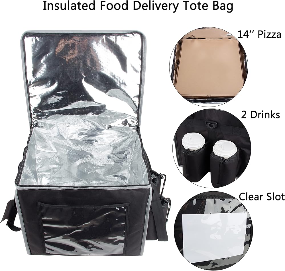 توصيل الطعام المعزول حراريًا: حقيبة توصيل الطعام مصنوعة من رقائق الألومنيوم الداخلية المعزولة حراريًا، ومساحة واسعة لحمل بيتزا مقاس 14 بوصة؛ جيبان خارجيان شبكيان لأواني الطعام ونافذة أمامية شفافة للحفاظ على استلام العميل.