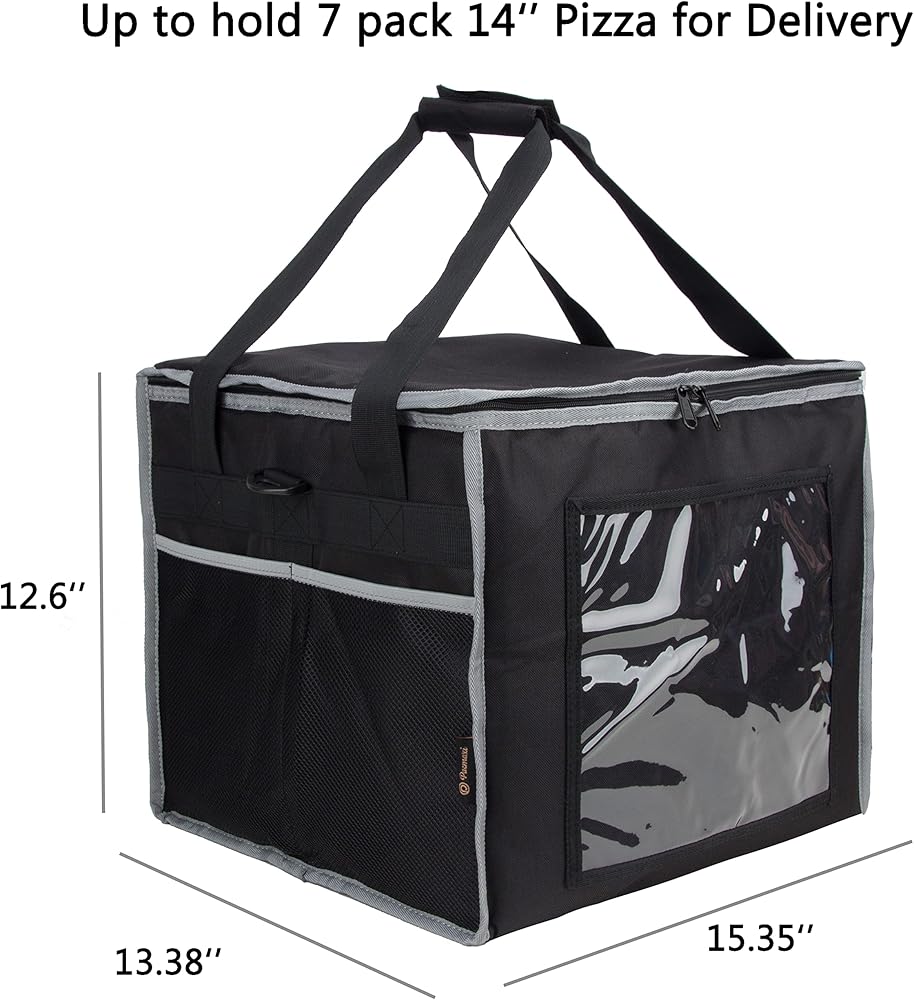 سعة كبيرة: حقيبة توصيل الطعام الخاصة بنا بأبعاد 15.35 × 13.38 × 12.6 بوصة تحمل ما يصل إلى 7 عبوات بيتزا مقاس 14 بوصة، والتي يمكنها تحميل 42 لترًا. إنها مناسبة لتوصيل البيتزا لعدة طلبات.