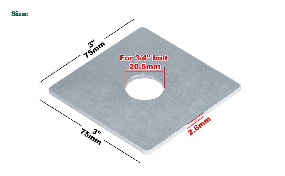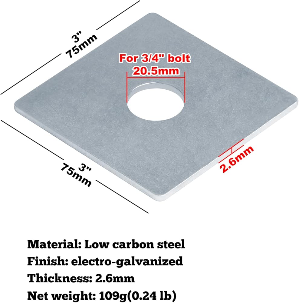 12 قطعة من غسالات الألواح المربعة 3/4 بوصة (ID) × 3 بوصة × 3 بوصة تقبل مسمار 3/4 بوصة، سمك فولاذي مجلفن كهربائيًا 2.6 مم تحمل غسالة مربعة مسطحة