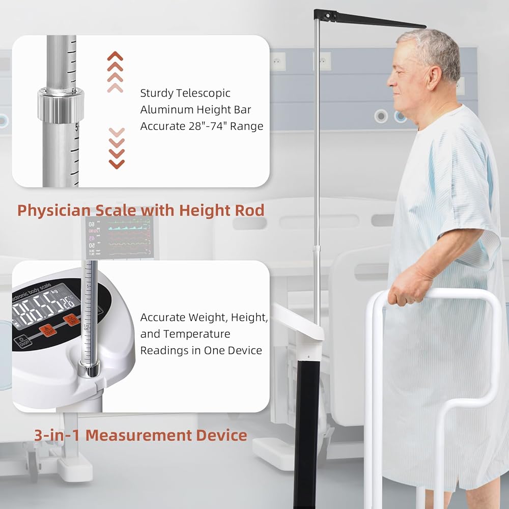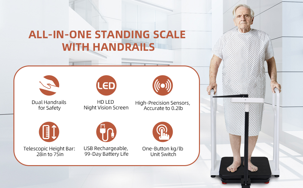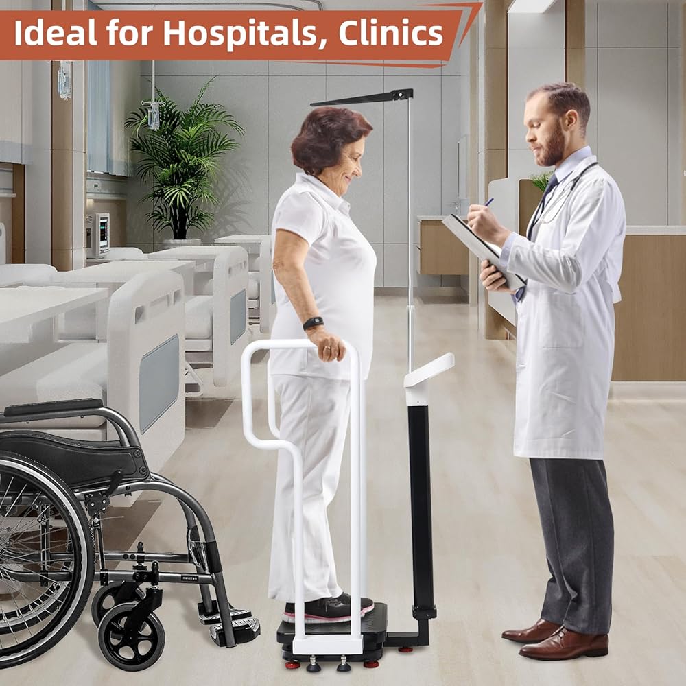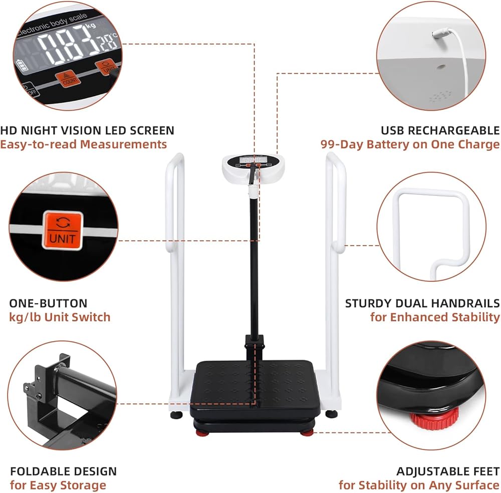 مقياس الوزن بمقابض لكبار السن، مقياس رقمي ذكي 3 في 1 مع قياس الارتفاع، مقياس الارتفاع والوزن لمكتب الطبيب، سعة الوزن 485 رطل/220 كجم، شاشة LED عالية الدقة، قابلة لإعادة الشحن عبر USB