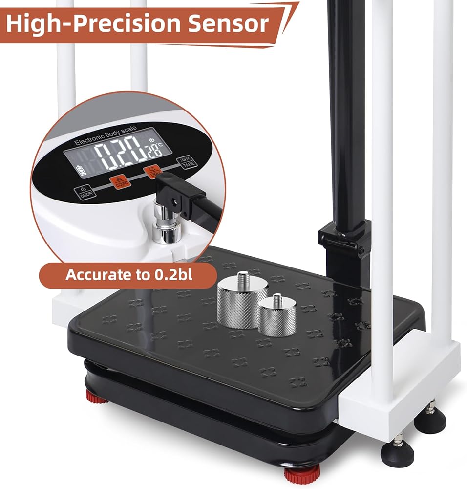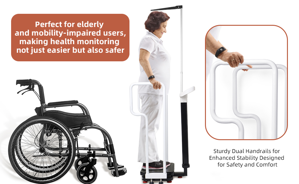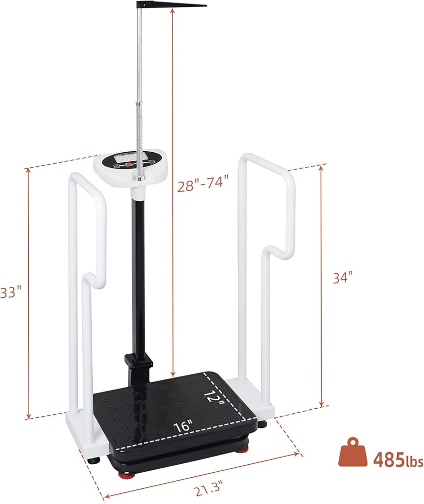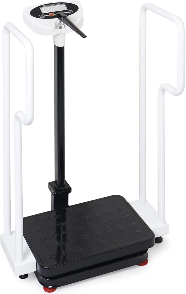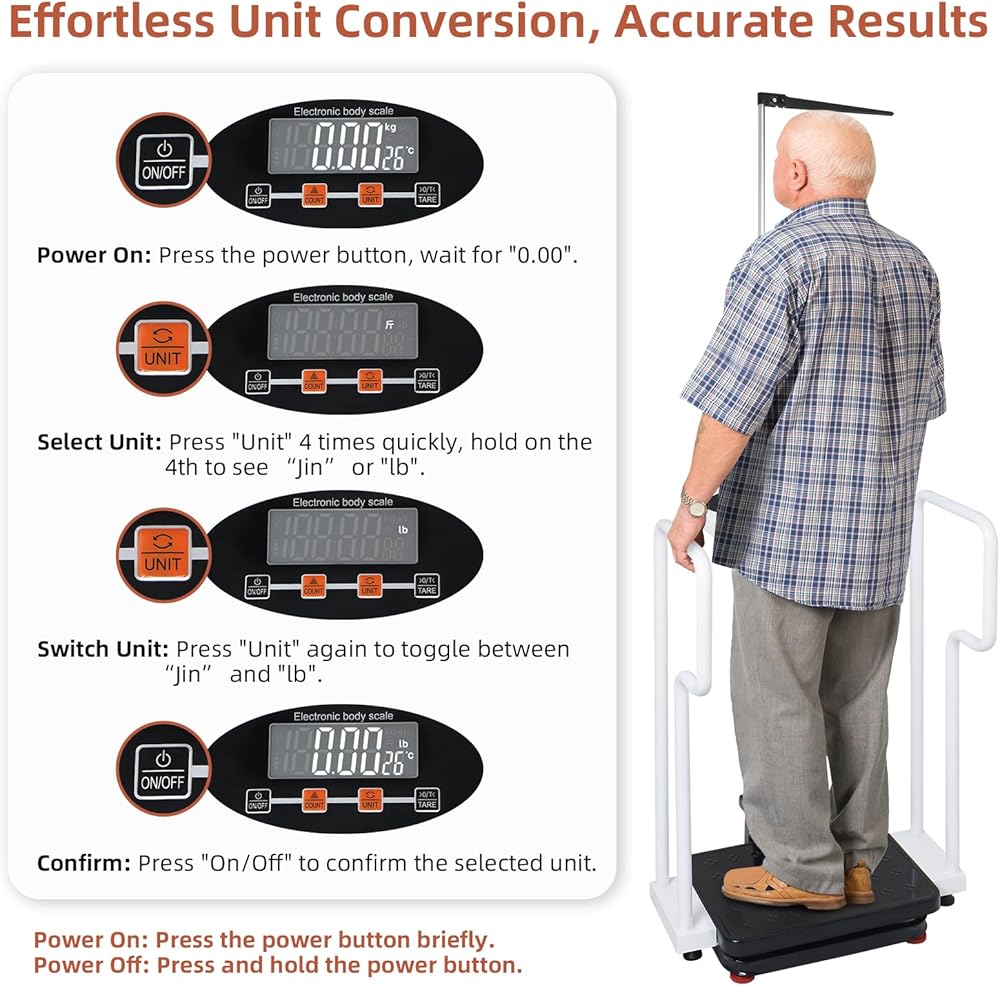 مقياس الوزن بمقابض لكبار السن، مقياس رقمي ذكي 3 في 1 مع قياس الارتفاع، مقياس الارتفاع والوزن لمكتب الطبيب، سعة الوزن 485 رطل/220 كجم، شاشة LED عالية الدقة، قابلة لإعادة الشحن عبر USB