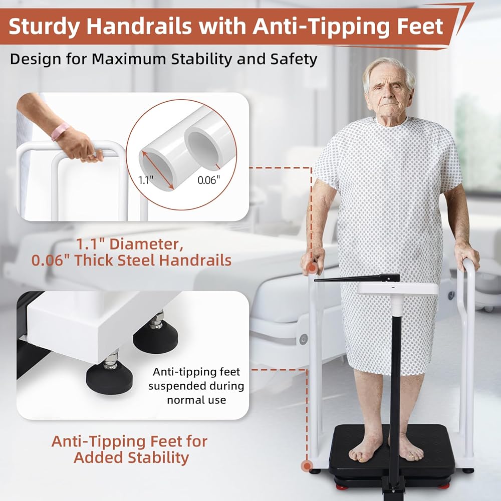 سعة 485 رطلًا مع درابزين مزدوج: استمتع بأقصى قدر من الاستقرار والدعم من خلال الدرابزين المزدوج المتين للمقياس السريري الخاص بنا، وهو مثالي لكبار السن والمستخدمين الذين يعانون من إعاقة في الحركة.