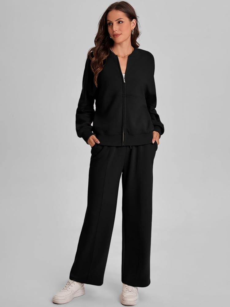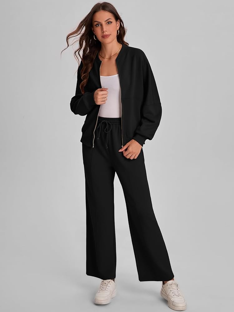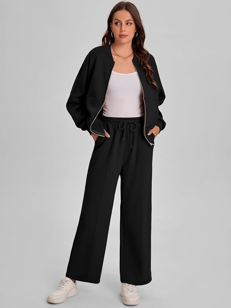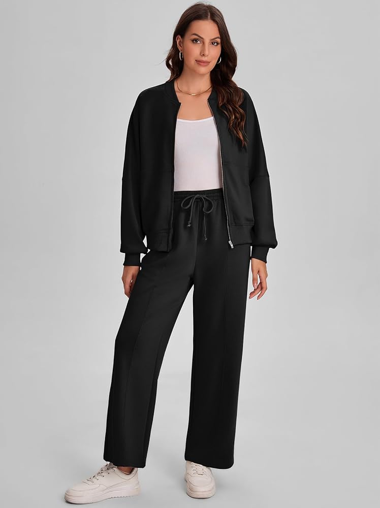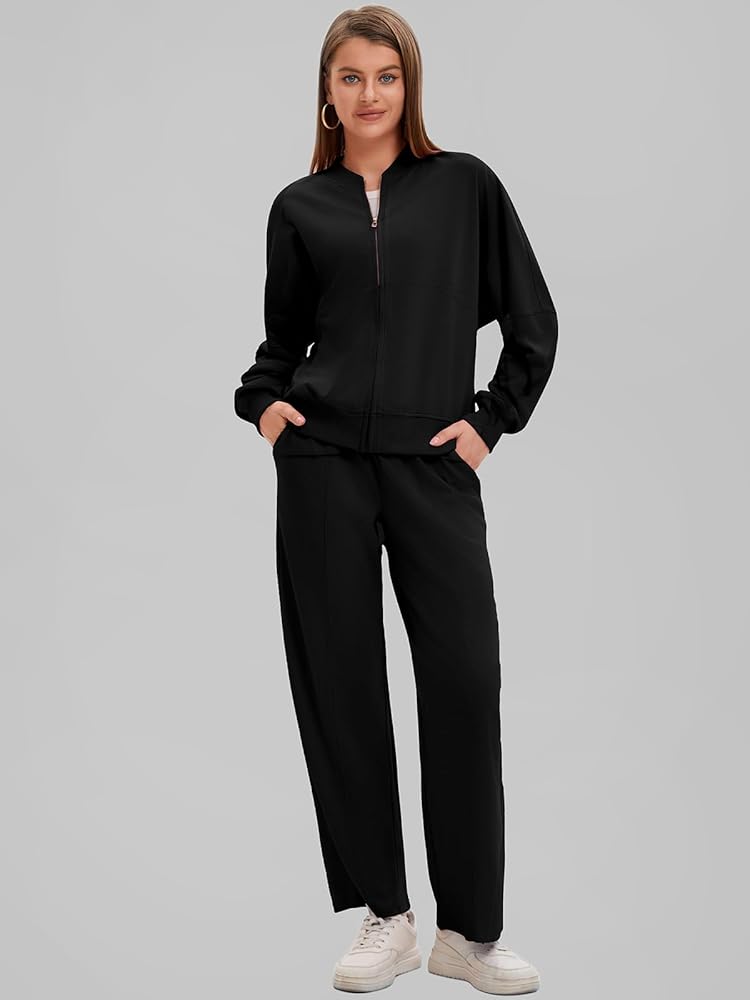 الميزات - تتميز هذه الملابس المكونة من قطعتين بلوزات كبيرة الحجم بسحاب وأكمام طويلة وأكتاف منسدلة وبنطلون بأرجل واسعة. يمكن أيضًا ارتداء الجزء العلوي والسفلي بشكل منفصل، وهو أيضًا لطيف ومريح.
